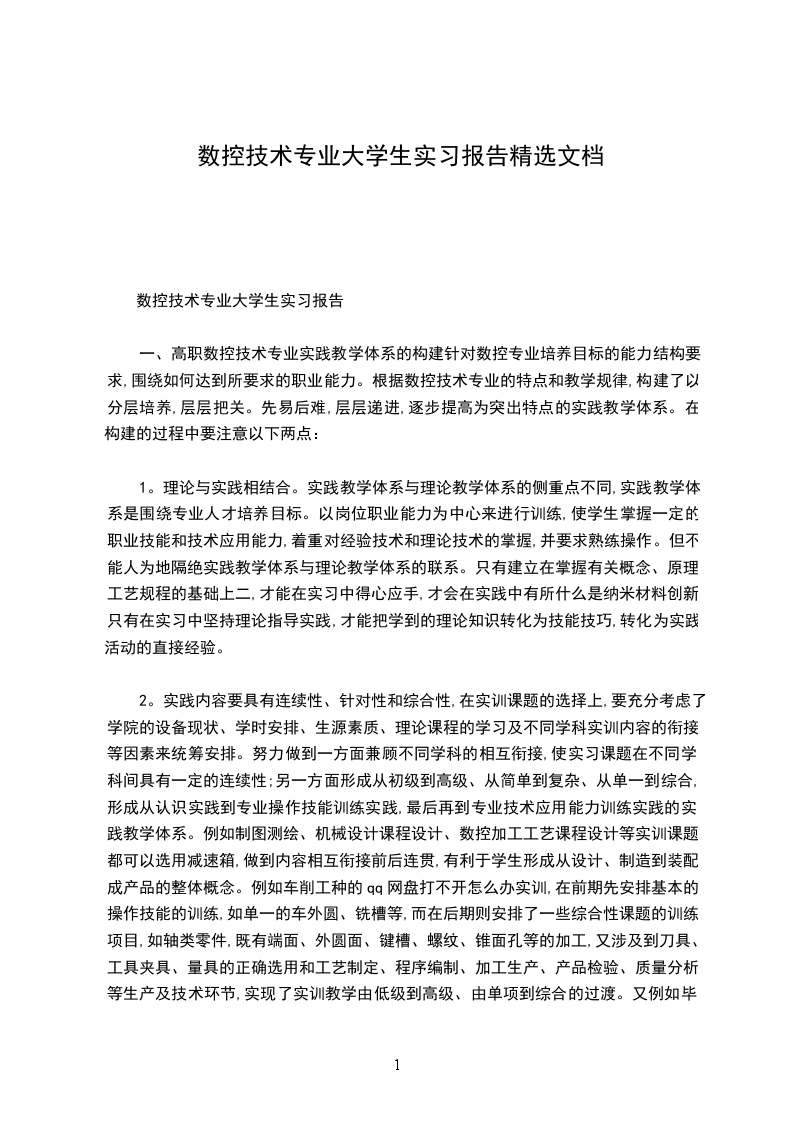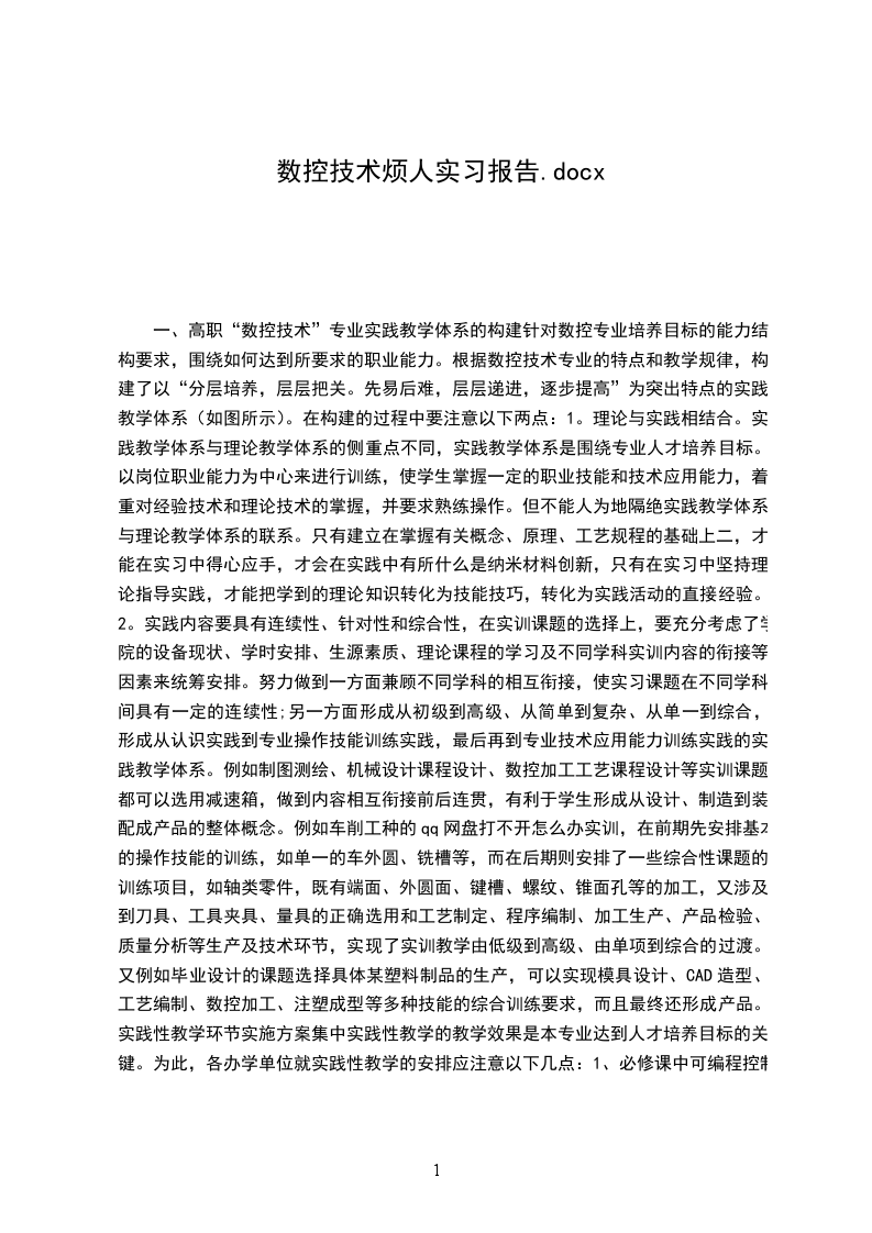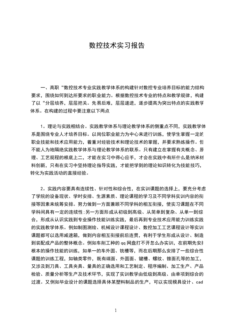 一、高职“数控技术”专业实践教学体系的构建针对数控专业培养目标的能力结构要求,围绕如何达到所要求的职业能力。根据数控技术专业的特点和教学规律,构建了以“分层培养,层层把关。先易后难,层层递进,逐步提高”为突出特点的实践教学体系。在构建的过程中要注意以下两点:lo理论与实践相结合。实践教学体系与理论教学体系的侧重点不同,实践教学体系是围绕专业人才培养目标。以岗位职业能力为中心来进行训练,使学生掌握一定的职业技能和技术应用能力,着重对经验技术和理论技术的掌握,并要求熟练操作。但不能人为地隔绝实践教学体系与理论教学体系的联系。只有建立在掌握有关概念、原理、工艺规程的基础上二,才能在实习中得心应手,才会在实践中有所什么是纳米材料创新,只有在实习中坚持理论指导实践,才能把学到的理论知识转化为技能技巧,转化为实践活动的直接经验。2o实践内容要具有连续性、针对性和综合性,在实训课题的选择上,要充分考虑了学院的设备现状、学时安排、生源素质、理论课程的学习及不同学科实训内容的衔接等因素来统筹安排。努力做到一方面兼顾不同学科的相互衔接,使实习课题在不同学科间具有一定的连续性;另一方面形成从初级到高级、从简单到复杂、从单一到综合,形成从认识实践到专业操作技能训练实践,最后再到专业技术应用能力训练实践的实践教学体系。例如制图测绘、机械设计课程设计、数控加工工艺课程设计等实训课题都可以选用减速箱,做到内容相互衔接前后连贯,有利于学生形成从设计、制造到装配成产品的整体概念。例如车削工种的qq网盘打不开怎么办实训,在前期先安排基本的操作技能的训练,如单一的车外圆、铳槽等,而在后期则安排了一些综合性课题的训练项目,如轴类零件,既有端面、外圆面、键槽、螺纹、锥面孔等的加工,又涉及到刀具、工具夹具、量具的正确选用和工艺制定、程序编制、加工生产、产品检验、质量分析等生产及技术环节,实现了实训教学由低级到高级、由单项到综合的过渡。又例如毕业设计的课题选择具体某塑料制品的生产,可以实现模具设计、cad造型、工艺编制、数控加工、注塑成型等多种技能的综合训练要求,而且最终还形成产品。实践性教学环节实施方案集中实践性教学的教学效果是本专业达到人才培养目标的关键。为此,各办学单位就实践性教学的安排应注意以下几点: