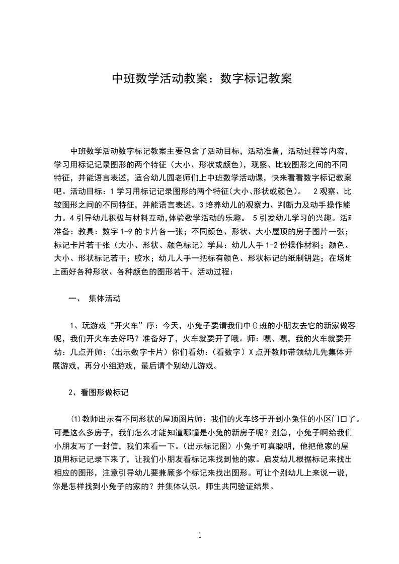 中班数学活动数字标记教案主要包含了活动目标,活动准备,活动过程等内容,学习用标记记录图形的两个特征(大小、形状或颜色),观察、比较图形之间的不同特征,并能语言表述,适合幼儿园老师们上中班数学活动课,快来看看数字标记教案吧。活动目标:1学习用标记记录图形的两个特征(大小、形状或颜色)。2观察、比较图形之间的不同特征,并能语言表述。3培养幼儿的观察力、判断力及动手操作能力。4引导幼儿积极与材料互动,体验数学活动的乐趣。5引发幼儿学习的兴趣。活动准备:教具:数字1-9的卡片各一张;不同颜色、形状、大小屋顶的房子图片一张;标记卡片若干张(大小、形状、颜色标记)学具:幼儿人手1-2份操作材料;颜色、大小、形状标记若干;胶水;幼儿人手一把标有颜色、形状标记的纸制钥匙;在场地上画好各种形状、各种颜色的图形若干。活动过程: