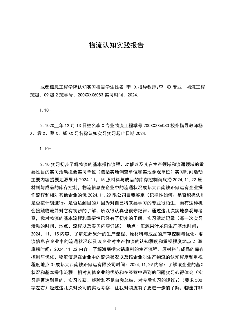 2.1020__年12月13日姓名李X专业物流工程学号200XXXX6083校外指导教师杨X、袁X、蔡X、杨XX习名称认知实习实习起止日期2024.