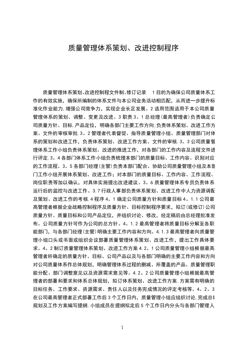 第四章第四节质量体系策划编制:张X第2版第0次修改审核:张X生效日期:编号:YZ/IH-MA011/2003批准:周传新页数:1目的通过质量体系策划达到质量方针和质量目标规定的要求.2适用范围适用酒店质量体系及产品实现的策划.3引用标准ISO9001:2000策划产品实现的策划设计和开发GB/T143XXXX1997旅游涉外饭店星级的划分及评定4职责总经理负责质量目标和质量计划的批准。总经理确保对实现质量目标所需的资源进行识别和策划。总经办负责酒店质量体系的策划,并组织各相关部门实施。总经理应保证生产/服务设施设备及提供适宜的工作环境,负责对部门设施设备及生产/服务过程的改进审核批准。管理者代表负责监督各部门产品实现的策划是否按照文件规定的要求进行.各部门依据质量体系文件规范有效地进行本部门质量体系、产品实现和服务质量的策划。