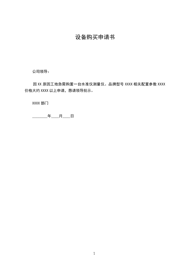 因XX原因工地急需购置一台水准仪测量仪。品牌型号XXXX相关配置参数XXXX价格大约XXXX以上申请,恳请领导批示。