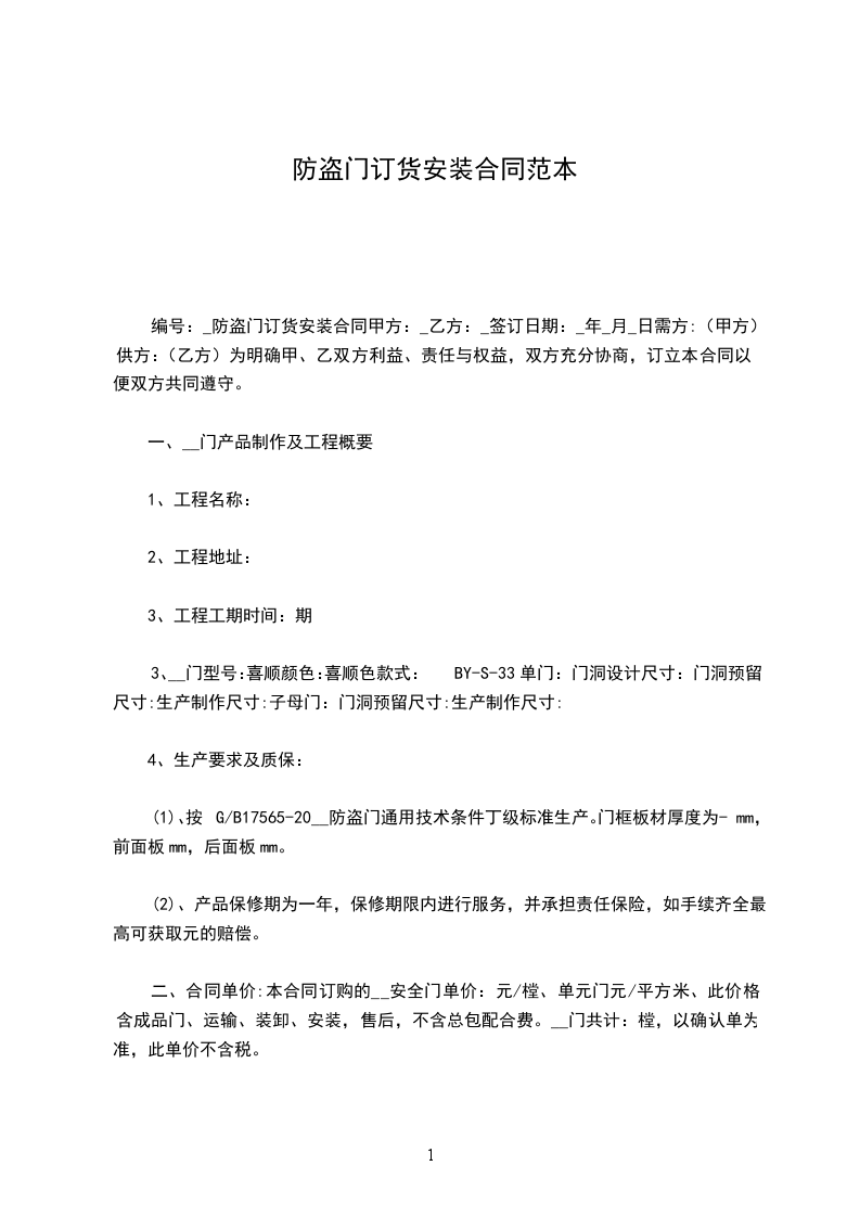 编号:_防盗门订货安装合同甲方:_乙方:_签订日期:_年_月_日需方:(甲方)供方:(乙方)为明确甲、乙双方利益、责任与权益,双方充分协商,订立本合同以便双方共同遵守。