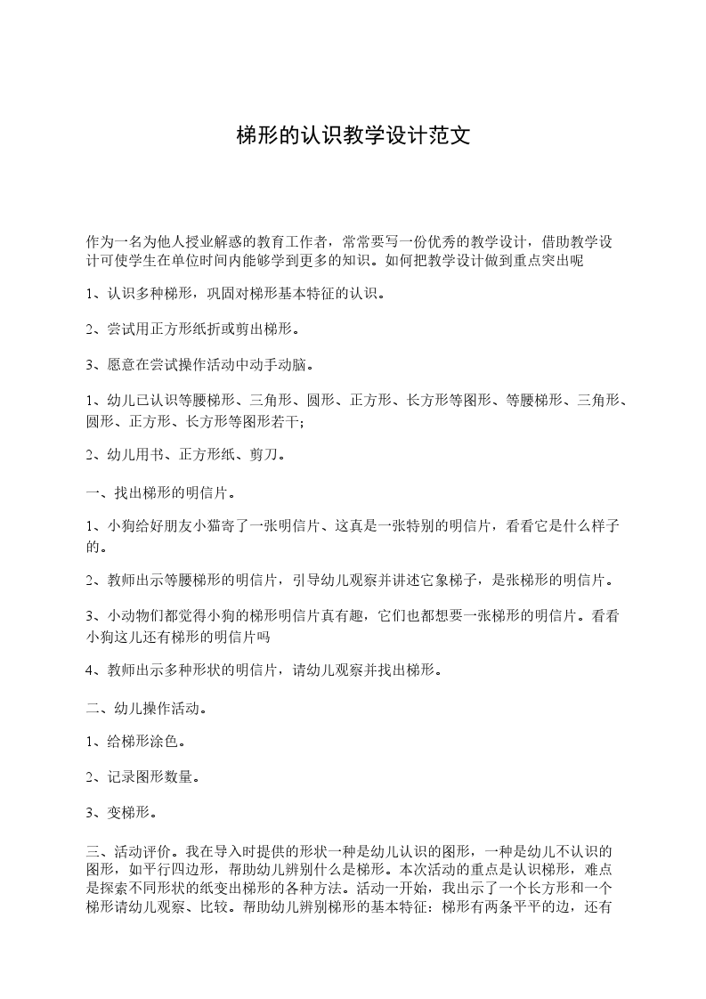 三、活动评价。我在导入时提供的形状一种是幼儿认识的图形,一种是幼儿不认识的图形,如平行四边形,帮助幼儿辨别什么是梯形。本次活动的重点是认识梯形,难点是探索不同形状的纸变出梯形的各种方法。活动一开始,我出示了一个长方形和一个梯形请幼儿观察、比较。帮助幼儿辨别梯形的基本特征:梯形有两条平平的边,还有两条斜斜的边。动手操作,让孩子在操作中获取新知。在接下来的活动中,我根据教学内容设计了两个动手操作活动。