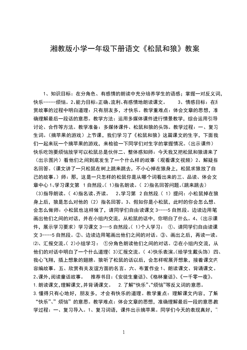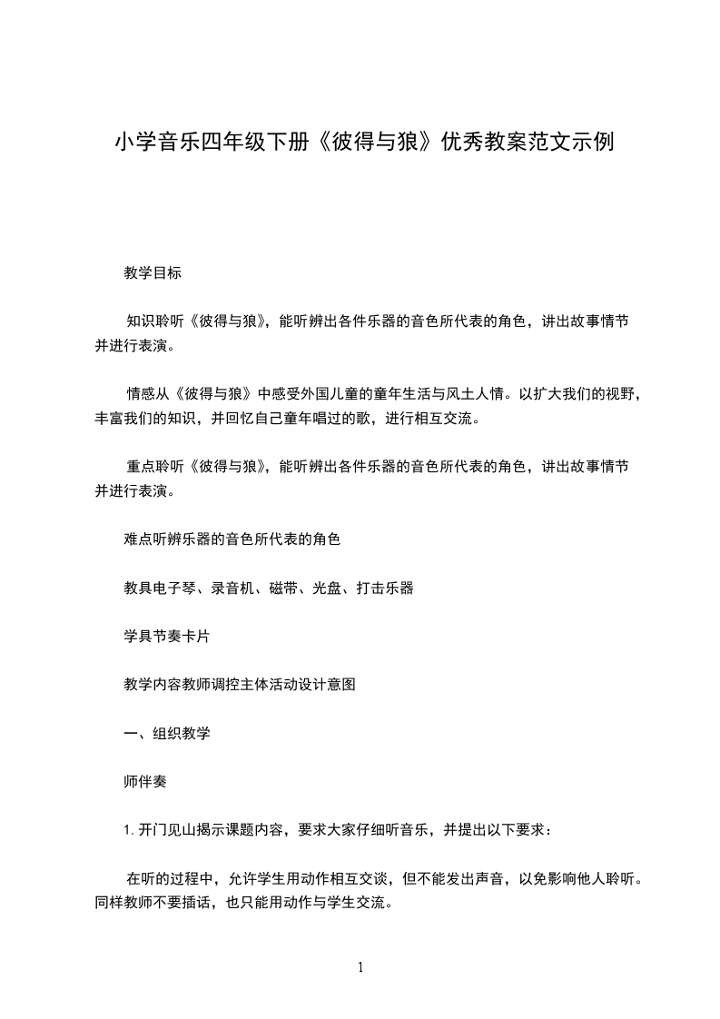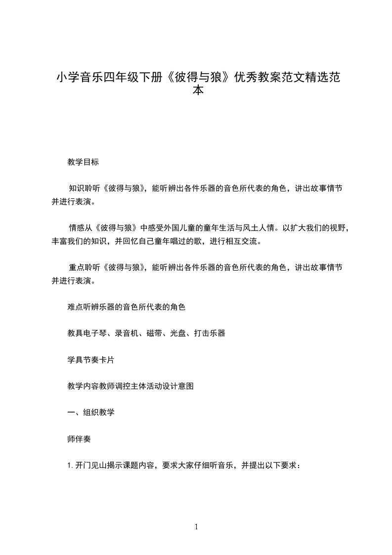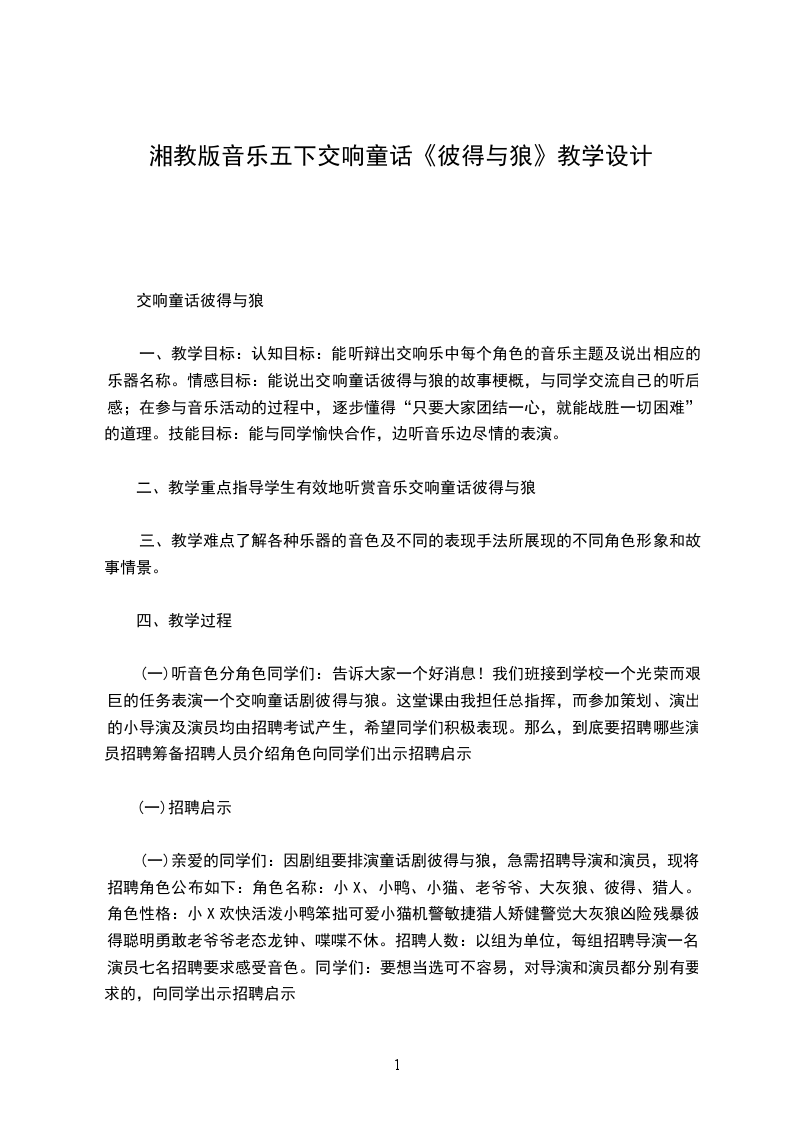 一、教学目标:认知目标:能听辩出交响乐中每个角色的音乐主题及说出相应的乐器名称。情感目标:能说出交响童话彼得与狼的故事梗概,与同学交流自己的听后感;在参与音乐活动的过程中,逐步懂得“只要大家团结一心,就能战胜一切困难”的道理。技能目标:能与同学愉快合作,边听音乐边尽情的表演。