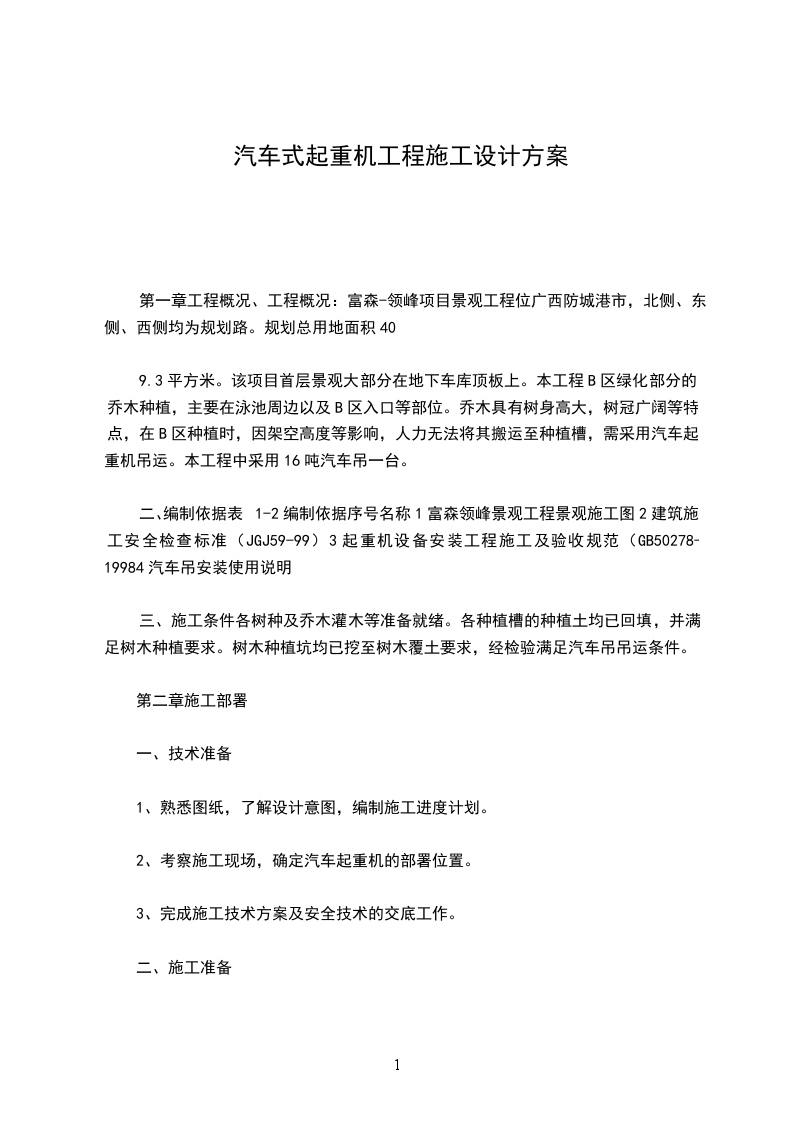 二、编制依据表1-2编制依据序号名称1富森领峰景观工程景观施工图2建筑施工安全检查标准(JGJ59-99)3起重机设备安装工程施工及验收规范(GB50278-19984汽车吊安装使用说明