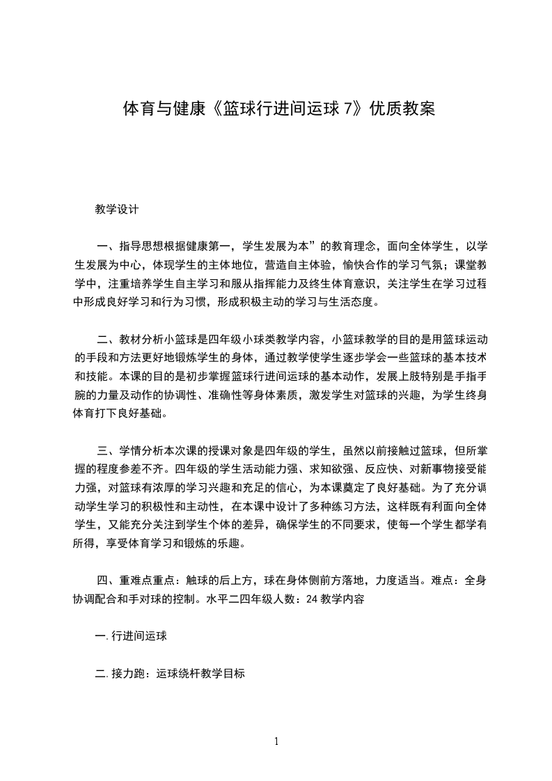 三、学情分析本次课的授课对象是四年级的学生,虽然以前接触过篮球,但所掌握的程度参差不齐。四年级的学生活动能力强、求知欲强、反应快、对新事物接受能力强,对篮球有浓厚的学习兴趣和充足的信心,为本课奠定了良好基础。为了充分调动学生学习的积极性和主动性,在本课中设计了多种练习方法,这样既有利面向全体学生,又能充分关注到学生个体的差异,确保学生的不同要求,使每一个学生都学有所得,享受体育学习和锻炼的乐趣。