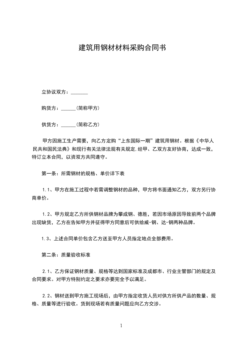 合同编号:? (甲方):? (乙方):? 经协商同意,根据中华人民共和国合同法的规定,订立合同如下:? 第一条 甲方向乙方订货总值为人民币元。? 第二条 产品名称、规格、(技术指标)? 。? 第三条 产品包装规格及费用? 。? 第四条 验收方法? 。? 第五条 货款及费用等付款及结算办法? 。? 第六条 交货规定? 1.交货方式:。? 2.交货地点:。? 3.交货日期:。? 4.运输费:。? 第七条 经济责任?(一)乙方应负的经济责任? 1.产品花色、品种、规格、质量不符本合同规定时,甲方同意利用者,按质论价。不能利用的,乙方应负责保修、保退、保换。由于上述原因致延误交货时间,每逾期一日,乙方应按逾期交货部分货款总值的万分之三计算向甲方偿付逾期交货的违约金。? 2.乙方未按本合同规定的产品数量交货时,少交的部分,甲方如果需要,应照数补交。甲方如不需要,可以退货。由于退货所造成的损失,由乙方承担。如甲方需要而乙方不能交货,则乙方应付给甲方不能交货部分货款总值的5%的罚金。? 3.产品包装不符本合同规定时,乙方应负责返修或重新包装,并承担返修或重新包的费用。如甲方要求不返修或不重新包装,乙方应按不符合同规定包装价值2%的罚金付给甲方。? 4.产品交货时间不符合同规定时,每延期一天,乙方应偿付甲方以延期交货部分货款总值万分之三的罚金。?(二)甲方应负的经济责任? 1.甲方如中途变更产品花色、品种、规格、质量或包装的规格,应偿付变更部分(或包装价值)总值%的罚金。? 2.甲方如中途退货,应事先与乙方协商,乙方同意退货的,应由甲方偿付乙方退货部分货款总值%的罚金。乙方不同意退货的,甲方仍按合同规定收货。? 3.甲方未按规定时间和要求向乙方交付技术资料、原材料或包装物时,除乙方得将交货日期顺延外,每顺延一日,甲方应付给乙方顺延交货产品总值万分之三的罚金。如甲方始终不能提出应提交的上述资料等,应视同中途退货处理。? 4.属甲方自提的材料,如甲方未按规定日期提货,每延期一天,应偿付乙方以延期提货部分货款总额万分之三的罚金。? 5.甲方如未按规定日期向乙方付款,每延期一天,应按延期付款总额万分之三计算付给乙方,作为延期罚金。? 6.乙方送货或代运的产品,如甲方拒绝接货,甲方应承担因此而造成的损失和运输费用及罚金。? 第八条 产品价格如须调整,必须经双方协商,并报请物价部门批准后方能变更。在物价主管部门批准前,仍应按合同原订价格执行。如乙方因价格问题而影响交货,则每延期交货一天,乙方应按延期交货部分总值的万分之三作为罚金付给甲方。? 第九条 甲、乙、任何一方如要求全部或部分注销合同,必须提出充分理由,经双方协商,并报请上级主管部门备案。提出注销合同一方须向对方偿付注销合同部分总额%的补偿金。? 第十条 如因生产资料、生产设备、生产工艺或市场发生重大变化,乙方须变更产品品种、花色、规格、质量、包装时,应提前天与甲方协商。? 第十一条 本合同所订一切条款,甲、乙任何一方不得擅自变更或修改。如一方单独变更、修改本合同,对方有权拒绝生产或收货,并要求单独变更、修改合同一方赔偿一切损失。? 第十二条 甲、乙任何一方如确因不可抗力的原因,不能履行本合同时,应及时向对方通知不能履行或须延期履行,部分履行合同的理由。在取得对方主管机关证明后,本合同可以不履行或延期履行或部分履行,并免予承担违约责任。? 第十三条 本合同在执行中如发生争议或纠纷,甲、乙双方应协商解决,解决不了时,任何一方均可向国家规定的合同管理机关申请调解仲裁。如一方对仲裁不服,可于接到仲裁书后15日内向人民法院起诉。? 第十四条 本合同自双方签章之日起生效,到乙方将全部订货送齐经甲方验收无误,并按本合同规定将货款结算以后作废。? 第十五条 本合同在执行期间,如有未尽事宜,得由甲乙双方协商,另订附则附于本合同之内,所有附则在法律上均与本合同有同等效力。? 相关的合同范本办公家具采购合同(苹果)采购合同粮食竞价采购合同农副产品采购书茶叶采购合同食品采购合同政府采购合同书建