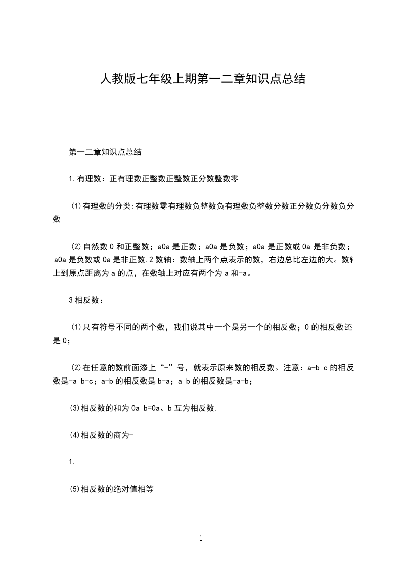 (2)自然数0和正整数;a0a是正数;a0a是负数;a0a是正数或0a是非负数;a0a是负数或0a是非正数.2数轴:数轴上两个点表示的数,右边总比左边的大。数轴上到原点距离为a的点,在数轴上对应有两个为a和-a。