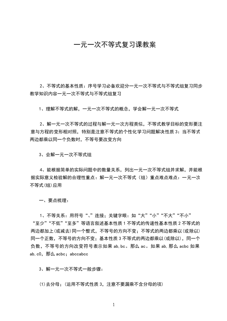 2、不等式的基本性质:序号学习必备欢迎分一元一次不等式与不等式组复习同步教学知识内容一元一次不等式与不等式组复习