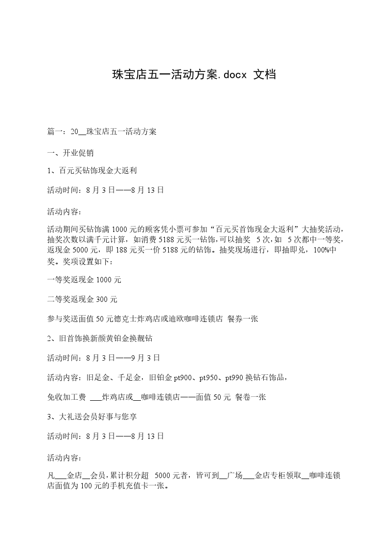 2、旧首饰换新颜黄铂金换靓钻活动时间:8月3日9月3日活动内容:旧足金、千足金,旧铂金pt900、pt950、pt990换钻石饰品,免收加工费+___炸鸡店或__咖啡连锁店面值50元餐卷一张