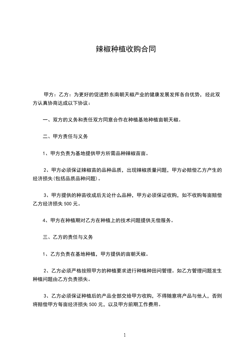 1.5元,收购品质为成熟的红椒,青椒价格保价1元/斤。如遇市场价格稳定上涨,甲方要根据上涨情况适时调整收购价格,如遇市场烂市甲方也将按合同价收购红椒