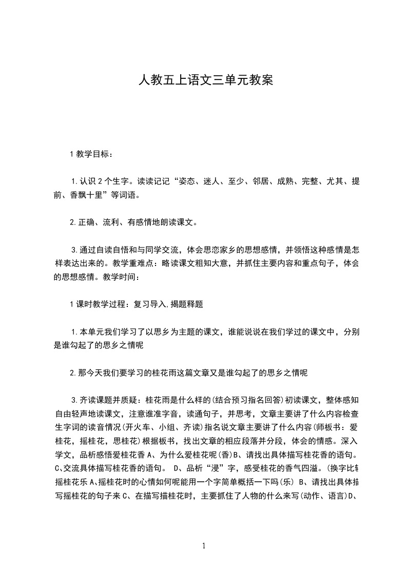 3.齐读课题并质疑:桂花雨是什么样的(结合预习指名回答)初读课文,整体感知自由轻声地读课文,注意谁准字音,读通句子,并思考,文章主要讲了什么内容检查生字词的读音情况(开火车、小组、齐读)指名说文章主要讲了什么内容(师板书:爱桂花,摇桂花,思桂花)根据板书,找出文章的相应段落并分段,体会的情感。深入学文,品析感悟爱桂花香A、为什么爱桂花呢(香)B、请找出具体描写桂花香的语句。C、交流具体描写桂花香的语句。D、品析“浸”字,感受桂花的香气四溢。(换字比较)摇桂花乐A、摇桂花时的心情如何呢能用一个字简单概括一下吗(乐)B、请找出具体描写摇桂花的句子来C、在描写描桂花时,主要抓住了人物的什么来写(动作、语言)D、请找出具体描写摇桂花时的动作来。E、仿写句子:,纷纷落下来,都是。我高兴地喊着:“!”体会桂花雨的多、美、香思桂花情