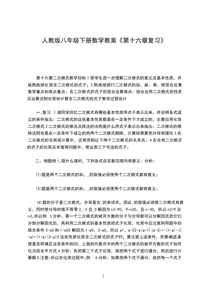 第十六章二次根式教学目标1使学生进一步理解二次根式的意义及基本性质,并能熟练地化简含二次根式的式子;2熟练地进行二次根式的加、减、乘、除混合运算教学重点和难点重点:含二次根式的式子的混合运算难点:综合运用二次根式的性质及运算法则化简和计算含二次根式的式子教学过程设计