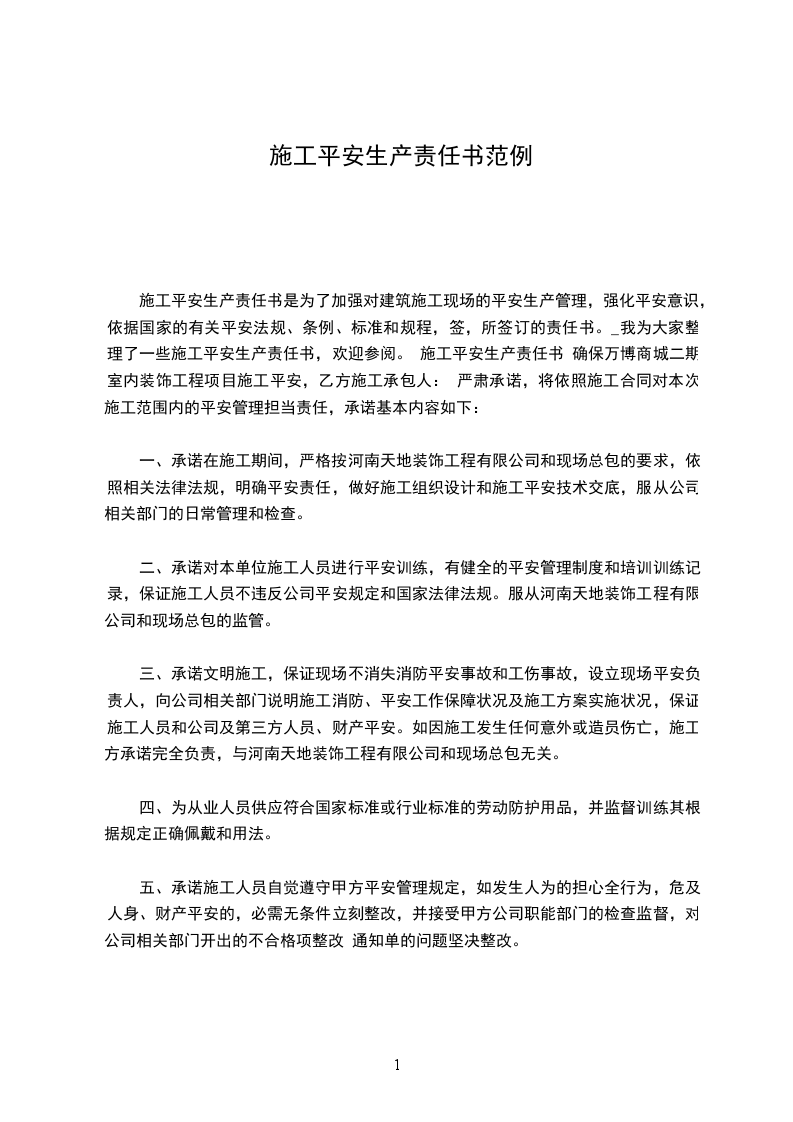 一、承诺在施工期间,严格按河南天地装饰工程有限公司和现场总包的要求,依照相关法律法规,明确平安责任,做好施工组织设计和施工平安技术交底,服从公司相关部门的日常管理和检查。