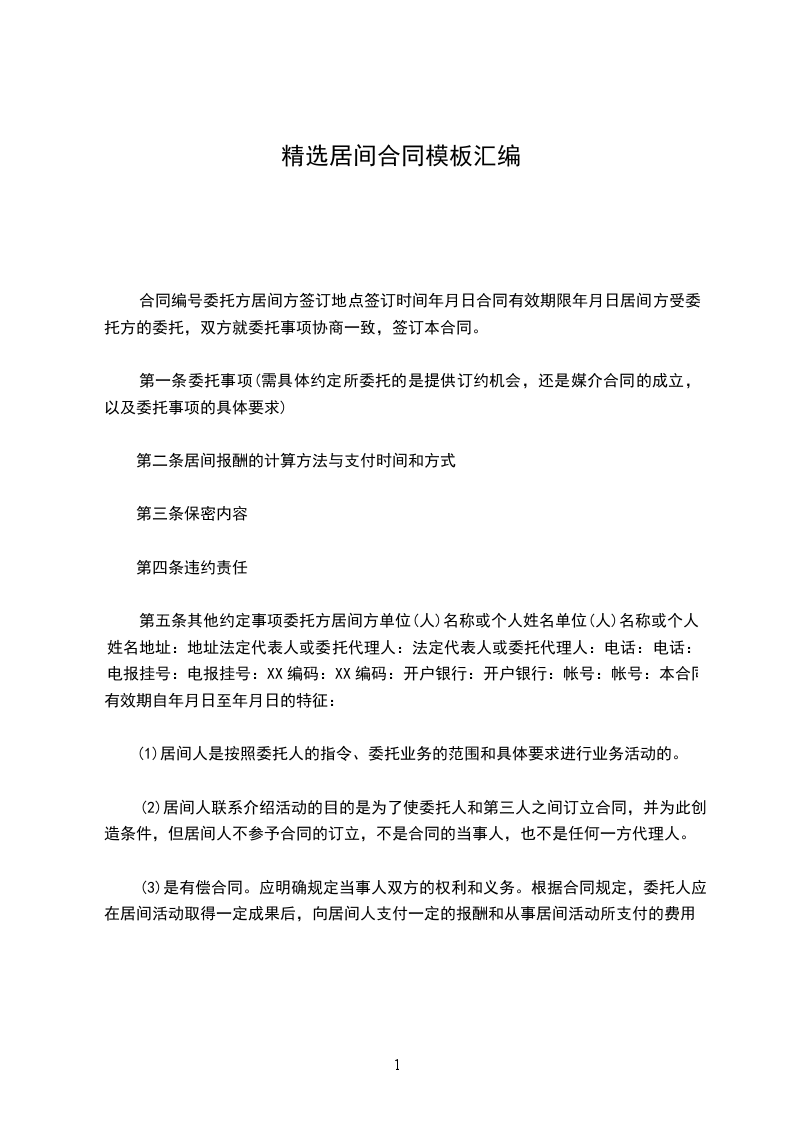 第五条其他约定事项委托方居间方单位(人)名称或个人姓名单位(人)名称或个人姓名地址:地址法定代表人或委托代理人:法定代表人或委托代理人:电话:电话:电报挂号:电报挂号:XX编码:XX编码:开户银行:开户银行:帐号:帐号:本合同有效期自年月日至年月日的特征: