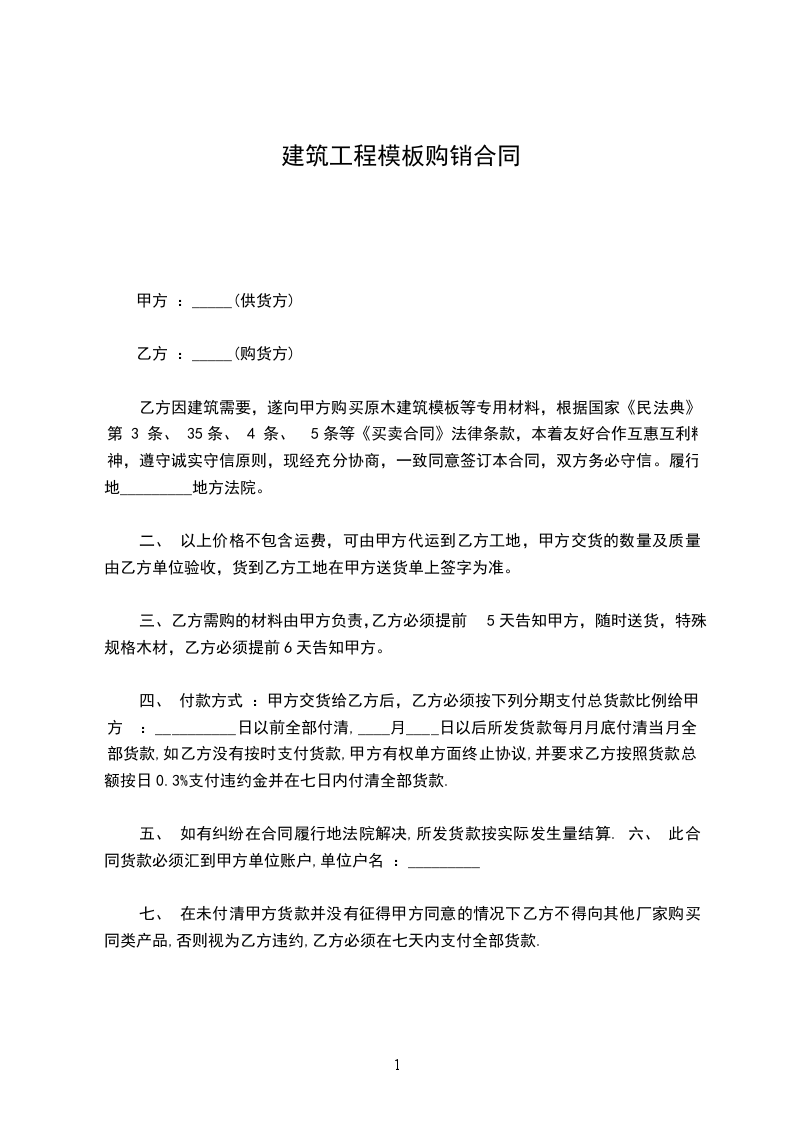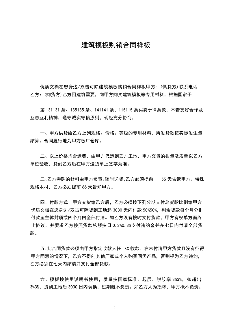 优质文档在您身边/双击可除建筑模板购销合同样板甲方:(供货方)联系电话:乙方:(购货方)乙方因建筑需要,向甲方购买建筑模板等专用材料,根据国家于