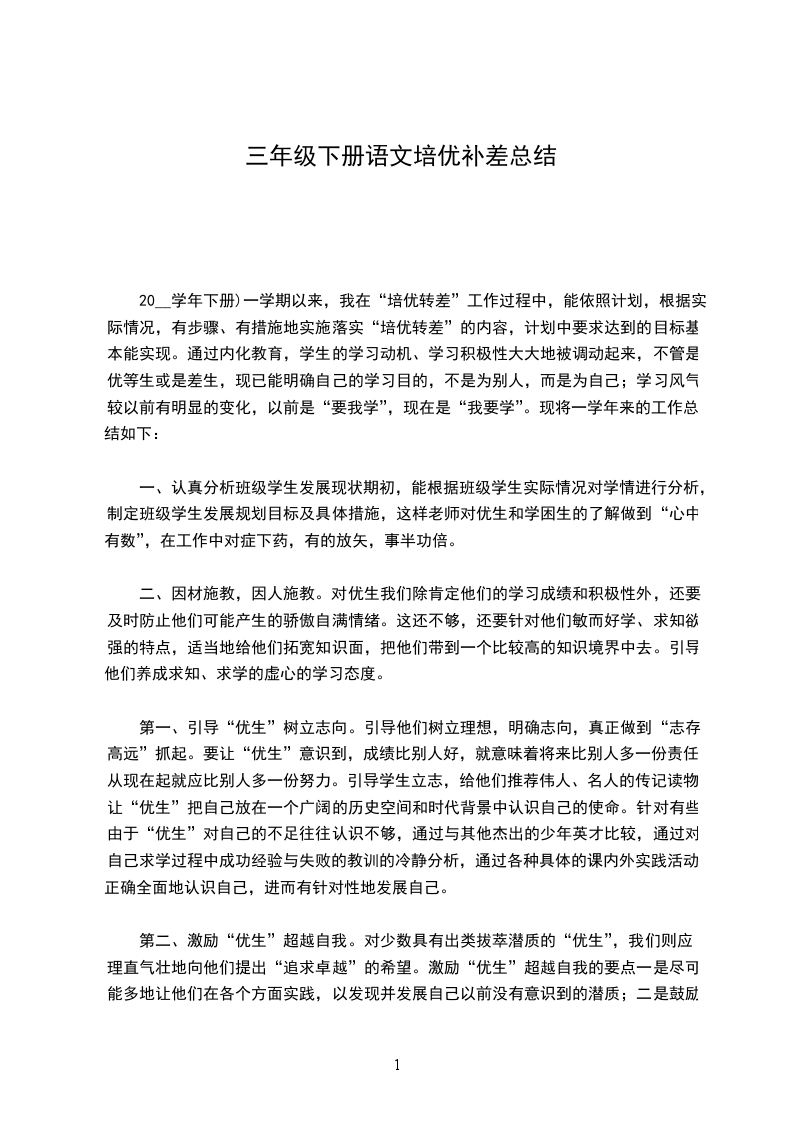 20__学年下册)一学期以来,我在“培优转差”工作过程中,能依照计划,根据实际情况,有步骤、有措施地实施落实“培优转差”的内容,计划中要求达到的目标基本能实现。通过内化教育,学生的学习动机、学习积极性大大地被调动起来,不管是优等生或是差生,现已能明确自己的学习目的,不是为别人,而是为自己;学习风气较以前有明显的变化,以前是“要我学”,现在是“我要学”。现将一学年来的工作总结如下: