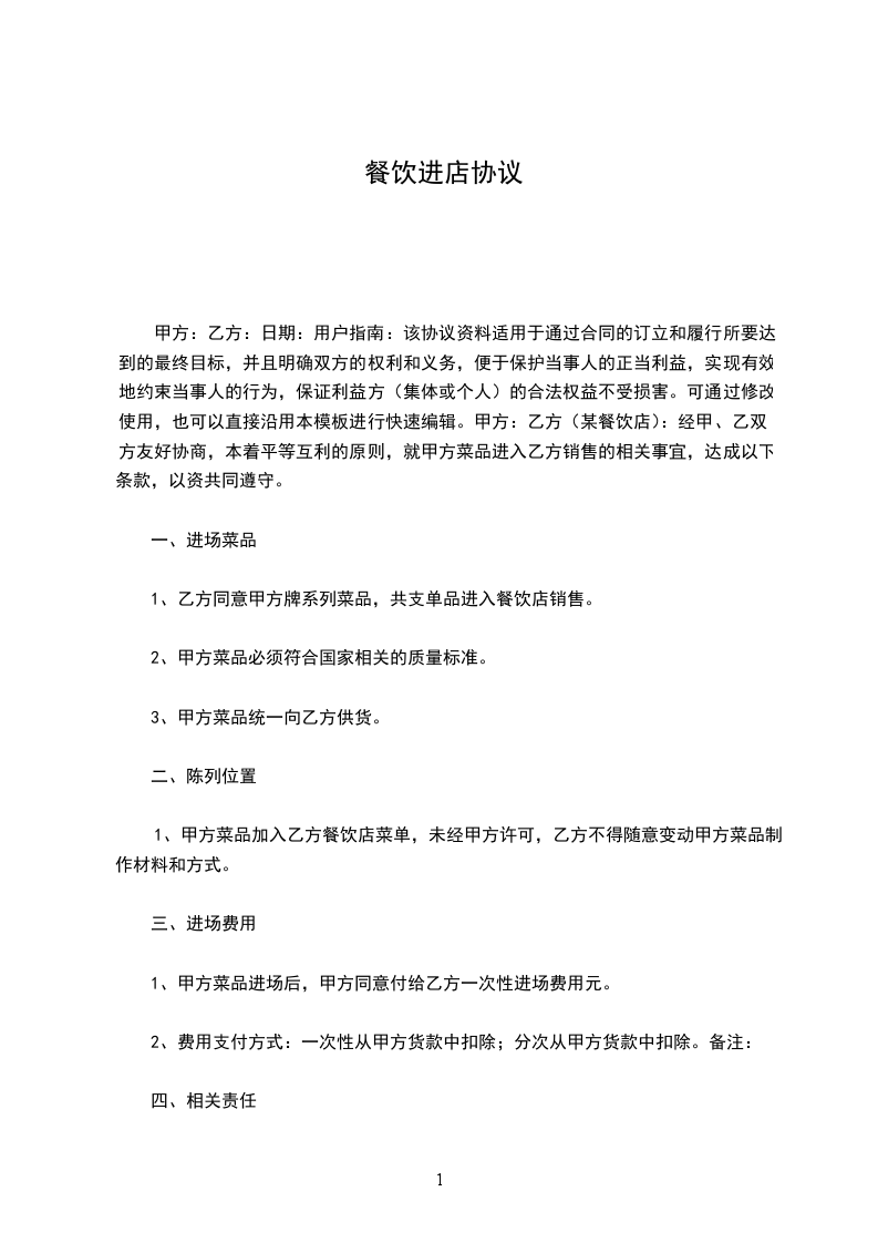 甲方:乙方:日期:用户指南:该协议资料适用于通过合同的订立和履行所要达到的最终目标,并且明确双方的权利和义务,便于保护当事人的正当利益,实现有效地约束当事人的行为,保证利益方(集体或个人)的合法权益不受损害。可通过修改使用,也可以直接沿用本模板进行快速编辑。甲方:乙方(某餐饮店):经甲、乙双方友好协商,本着平等互利的原则,就甲方菜品进入乙方销售的相关事宜,达成以下条款,以资共同遵守。