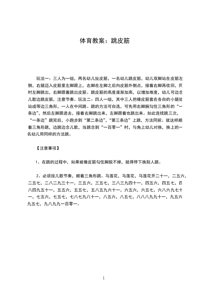 玩法一:三人为一组,两名幼儿扯皮筋,一名幼儿跳皮筋,幼儿双脚站在皮筋左侧,右腿迈入皮筋里左脚跟上,右脚在左脚之后向皮筋外侧点,接着右脚再收回,同时左脚跳出,右脚跟着跳出皮筋。跳皮筋的高度逐渐加高,以增加难度,幼儿可边念儿歌边跳皮筋,注意节奏。玩法二:四人一组,其中三人把橡皮筋套在各自的小腿处站成等边三角形,一人在中间跳。跳的方法可自选,可先用右脚腕勾住三角形的“一条边”,然后左脚跟进去,接着右脚跳出来,左脚跟着也跳出来。如此连续跳三次,“一条边”跳完后,小跑步到“第二条边”,“第三条边”上跳,方法同前。就这样顺着三角形跳,边跳边念儿歌,当跳念到“一百零一”时,与角上幼儿对换,换上的一名幼儿用同样的方法跳。