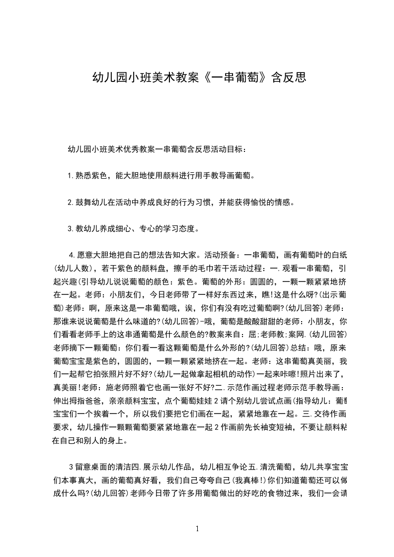 五、 作品展示。鼓励幼儿用自己的作品挂在葡萄架背景墙上。活动反思:在活动前,从材料选择上尝试用手揉纸、瓦楞纸和皱纹纸对比,发现手揉纸质感太软,不利于成型,瓦楞纸揉搓不够紧而且不利于黏贴,还是皱纹纸效果最佳且利于黏贴。在底版设计时,从小班幼儿的年龄特点和能力差异来考虑,对葡萄底版的大小进行尝试与调整,为普通幼儿提供想同大小的底版,而能力较强,操作速度快的幼儿提供了大一圈的葡萄底版。通过PPT与儿歌相结合,来帮助幼儿观看制作步骤图,了解、掌握制作葡萄的方法和黏贴一颗颗葡萄的过程。尝试揉搓纸团粘贴葡萄,发展小肌肉动作。巧妙地借助篱笆制作成葡萄架做展板,让幼儿的作品一一呈现,展示效果更佳。在教师示范的时候,可以提供一张手揉纸,每个人跟着老师来试一试,比一比谁搓的葡萄最紧、最圆?幼儿制作的时候更能心中有数。小百科:葡萄是世界最古老的果树树种之一,葡萄的植物化石发现于第三纪地层中,说明当时已遍布于欧、亚及格陵兰。