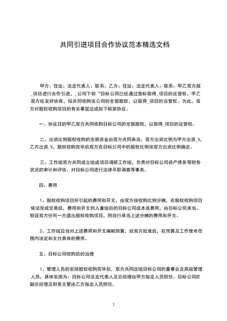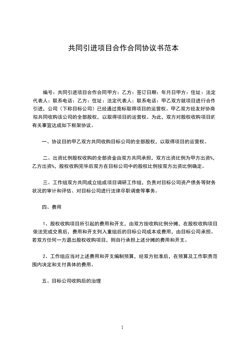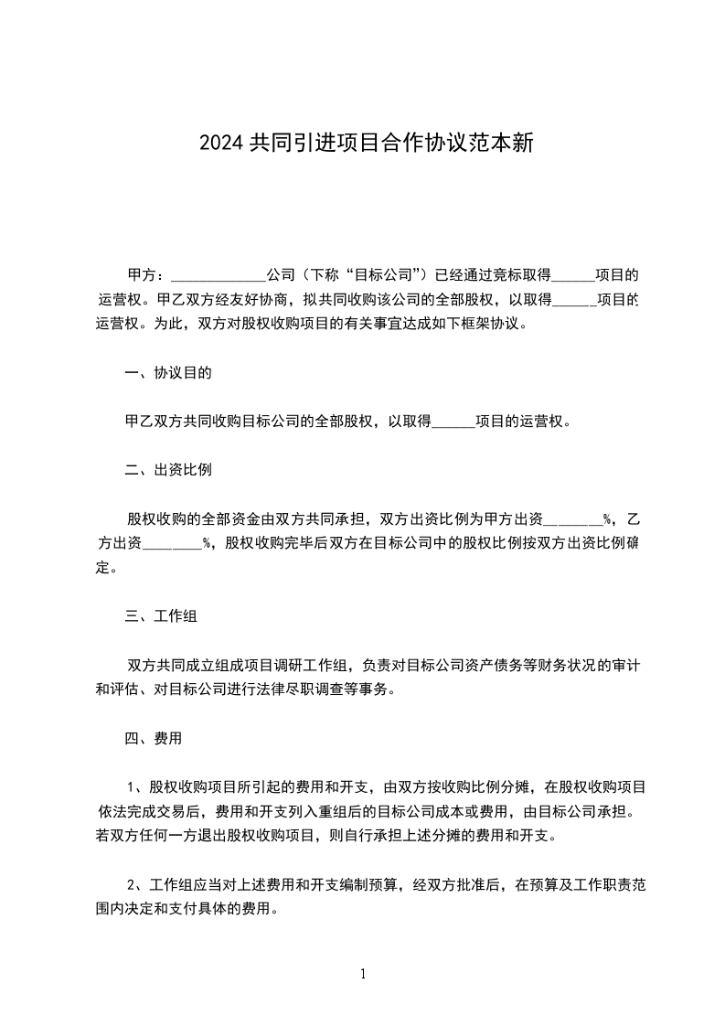 二、出资比例股权收购的全部资金曲双方共同承担,双方出资比例为甲方出资%,乙方出资%,股权收购完毕后双方在目标公司中的股权比例按双方出资比例确定。