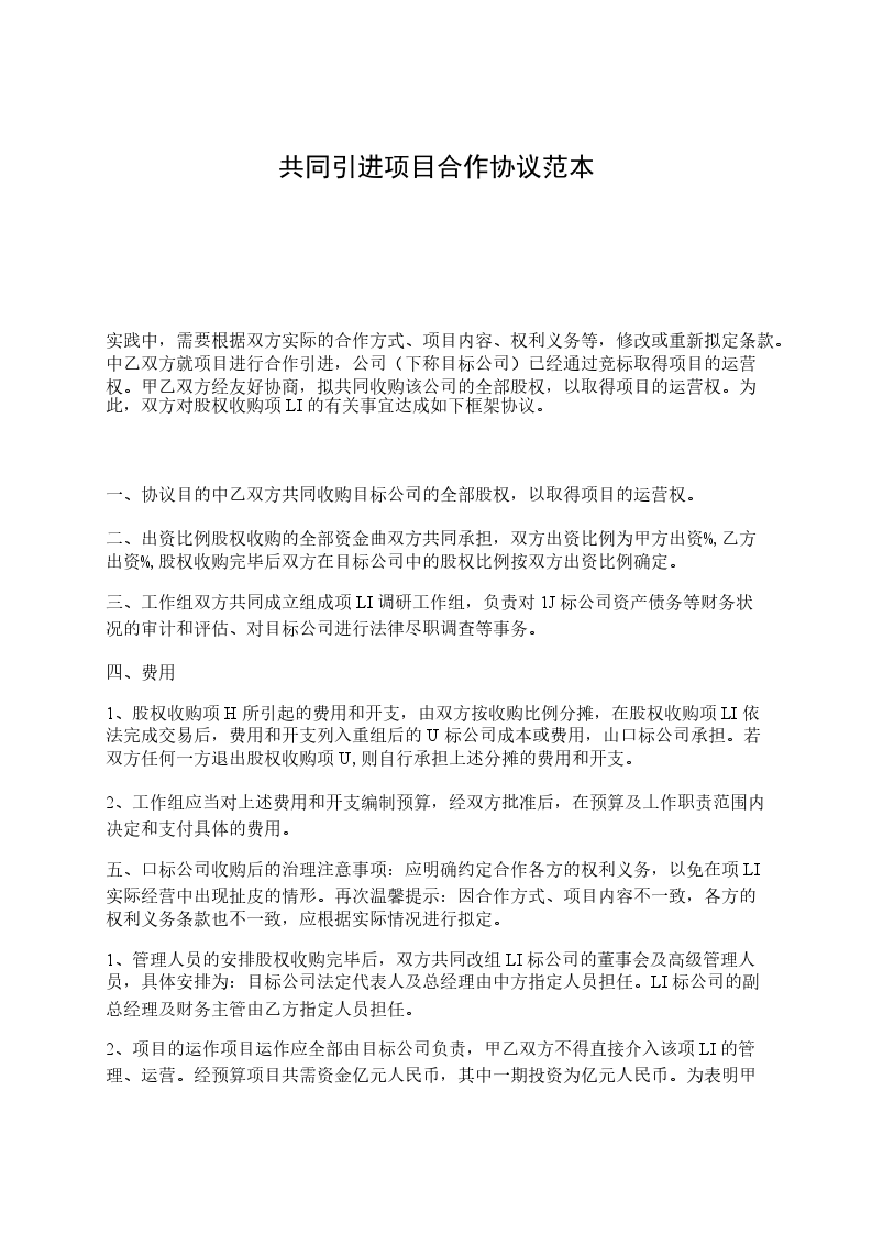 2、项目的运作项目运作应全部由目标公司负责,甲乙双方不得直接介入该项LI的管理、运营。经预算项目共需资金亿元人民币,其中一期投资为亿元人民币。为表明甲乙双方的资本实力,甲乙双方应在日之前共同备足一期投资所需的款项亿元人民币,并以乙方名义向相关主体提供相应的资信证明。