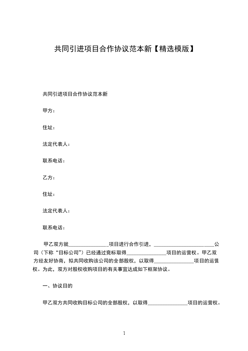 一、协议目的中乙双方共同收购目标公司的全部股权,以取得项目的运营权。