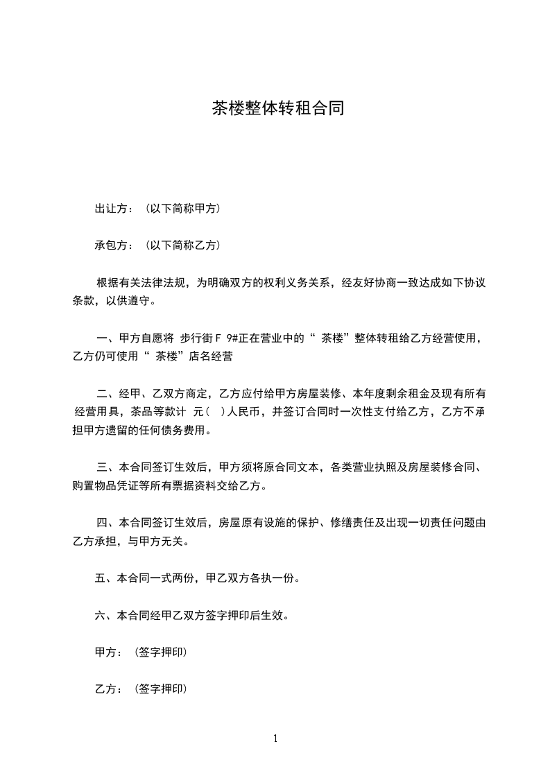 一、甲方将位于________________的茶楼转让给乙方,转让内容为茶楼________平方米租赁使用权及茶楼所有配套设备设施的所有权。