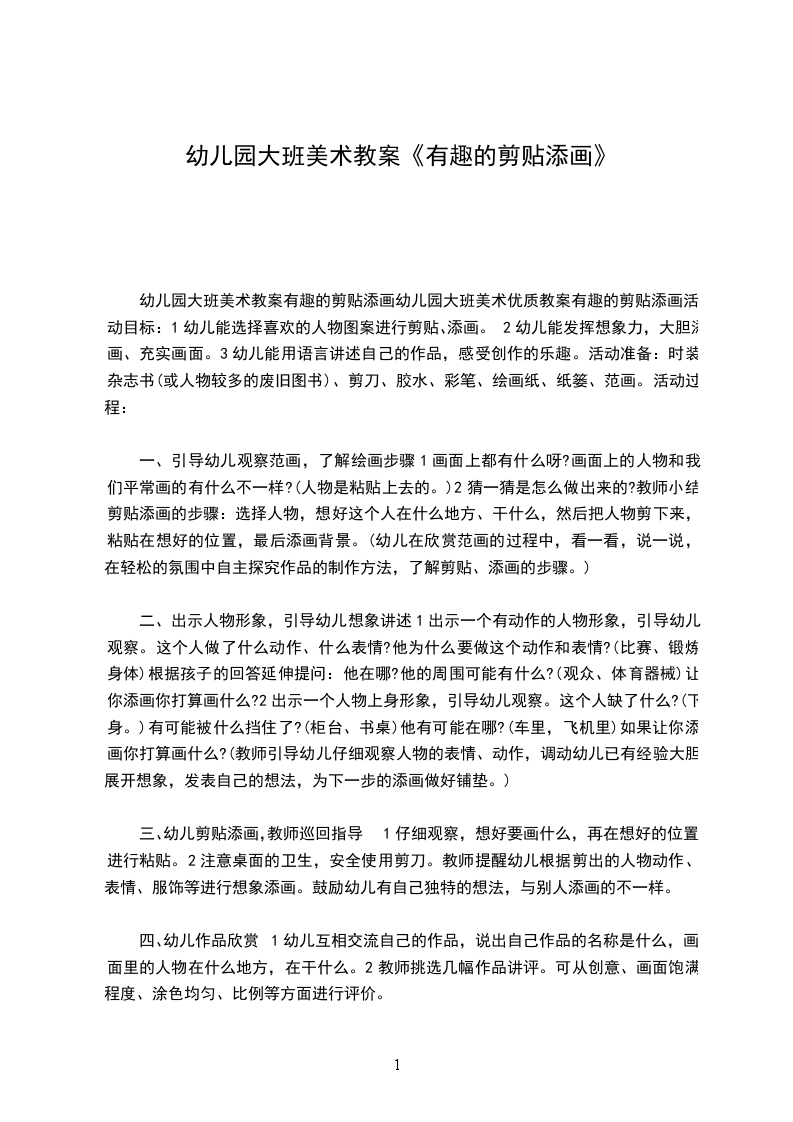 幼儿园大班美术教案有趣的剪贴添画幼儿园大班美术优质教案有趣的剪贴添画活动目标:1幼儿能选择喜欢的人物图案进行剪贴、添画。2幼儿能发挥想象力,大胆添画、充实画面。3幼儿能用语言讲述自己的作品,感受创作的乐趣。活动准备:时装杂志书(或人物较多的废旧图书)、剪刀、胶水、彩笔、绘画纸、纸篓、范画。活动过程: