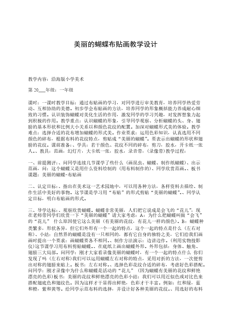 课时:一课时教学目标:通过布贴画的学习,对同学进行审美教育,培养同学热爱劳动、互相协助的美德。初步学会布贴画的方法,培养同学的形象概括能力养成耐心细致的习惯。认识装饰蝴蝶对美化生活的作用,激发同学的学习兴趣,对发挥想象力起到积极的作用。教学重点:认识蝴蝶的形象,引导同学观察、分析蝴蝶的头、身、翅膀的基本形状和比例大小关系以和颜色花纹的配置。加深对蝴蝶形式美的体验。教学难点:选择合适的花布增加蝴蝶的形式美。作业要求:运用色彩知识,认真选用不同颜色的碎布,根据布料的花纹特点,剪贴成“美丽的蝴蝶”。要表示出蝴蝶的形状和翅膀的花纹。课前准备:、学具:若干颜色、花纹不同的碎布,剪刀,胶水,开卡纸一张人。、教具:范画,幻灯片,大卡纸一张,胶水,录音带,(录像带)教学过程: