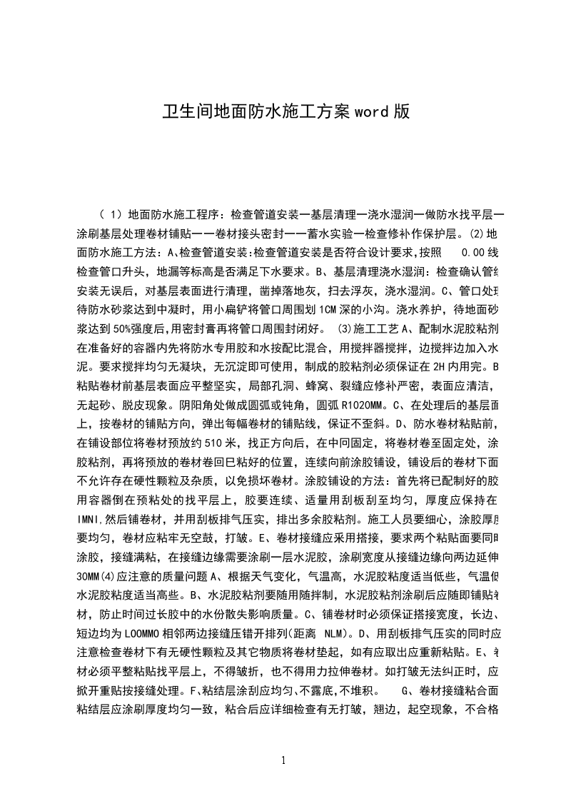 三、卫生间防水卫生间防水涂料卫生间涂料采用水泥基渗透结晶型防水涂料,用量为1.0Kg/M2。水泥基渗透结晶型防水涂料为无机刚性防水涂料,涂刷后与基层能形成整体,与主体结构形成良好的粘结力,并可以渗透混凝土表层,提高了主体结构的防渗能力。