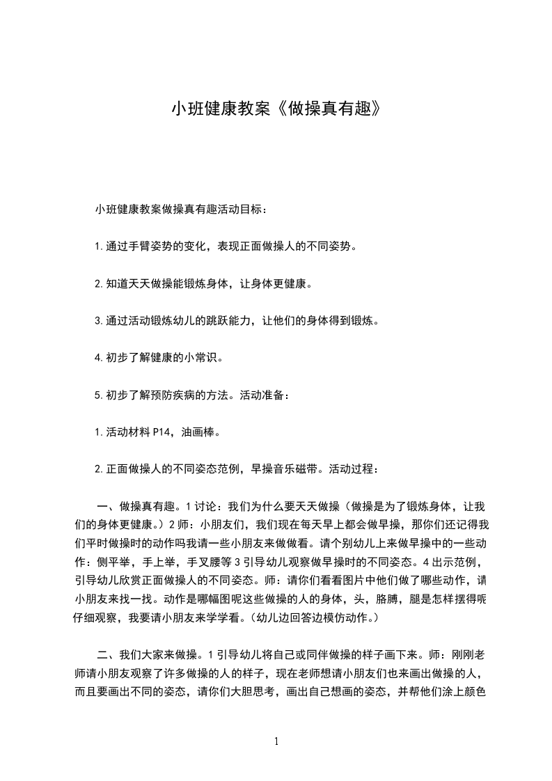 一、做操真有趣。1讨论:我们为什么要天天做操(做操是为了锻炼身体,让我们的身体更健康。)2师:小朋友们,我们现在每天早上都会做早操,那你们还记得我们平时做操时的动作吗我请一些小朋友来做做看。请个别幼儿上来做早操中的一些动作:侧平举,手上举,手叉腰等3引导幼儿观察做早操时的不同姿态。4出示范例,引导幼儿欣赏正面做操人的不同姿态。师:请你们看看图片中他们做了哪些动作,请小朋友来找一找。动作是哪幅图呢这些做操的人的身体,头,胳膊,腿是怎样摆得呢仔细观察,我要请小朋友来学学看。(幼儿边回答边模仿动作。)