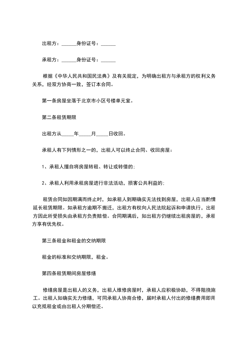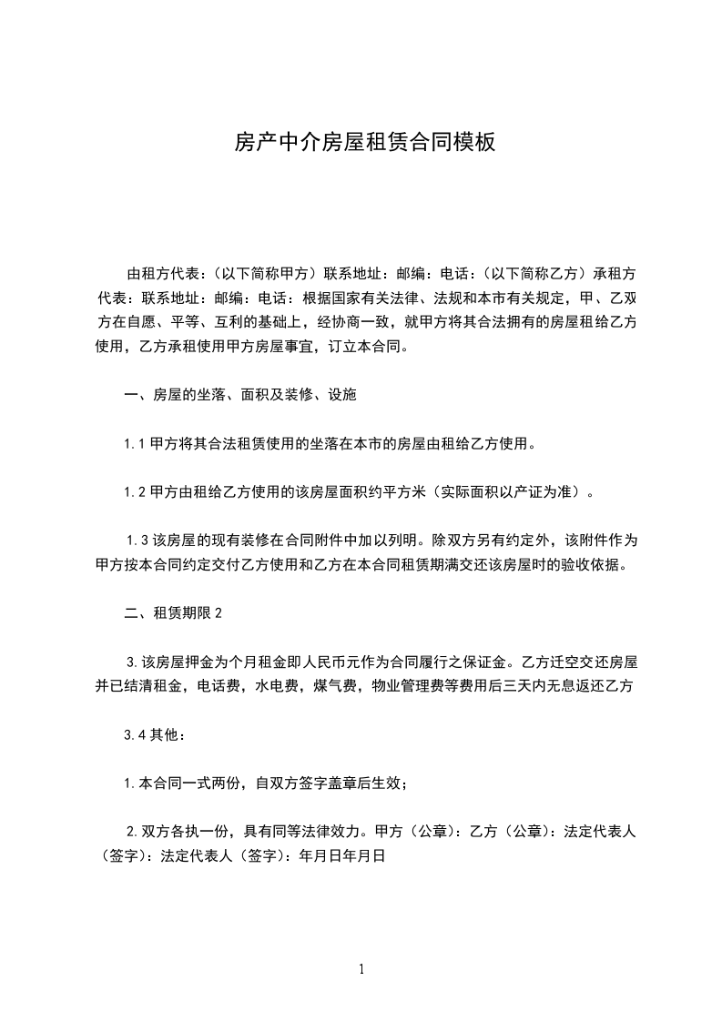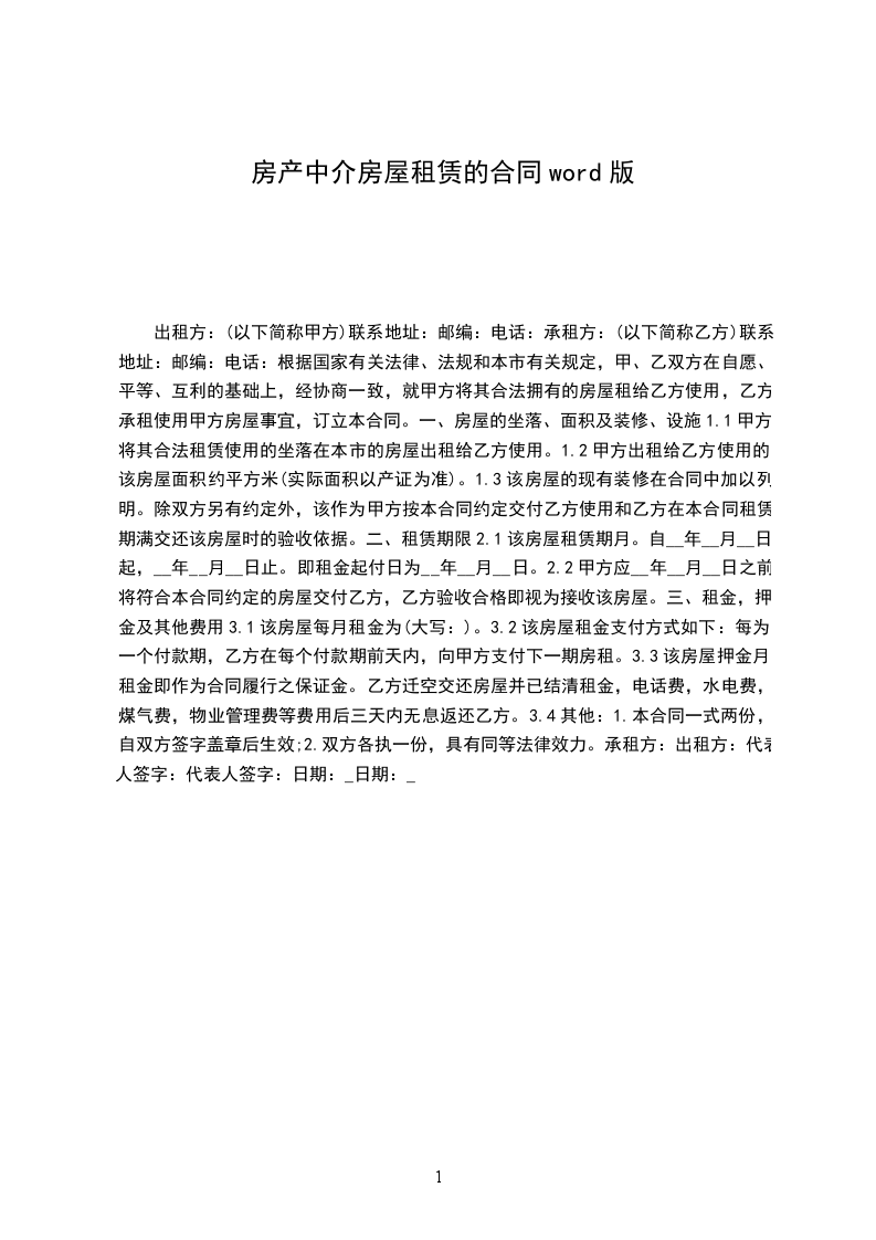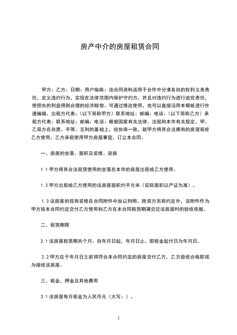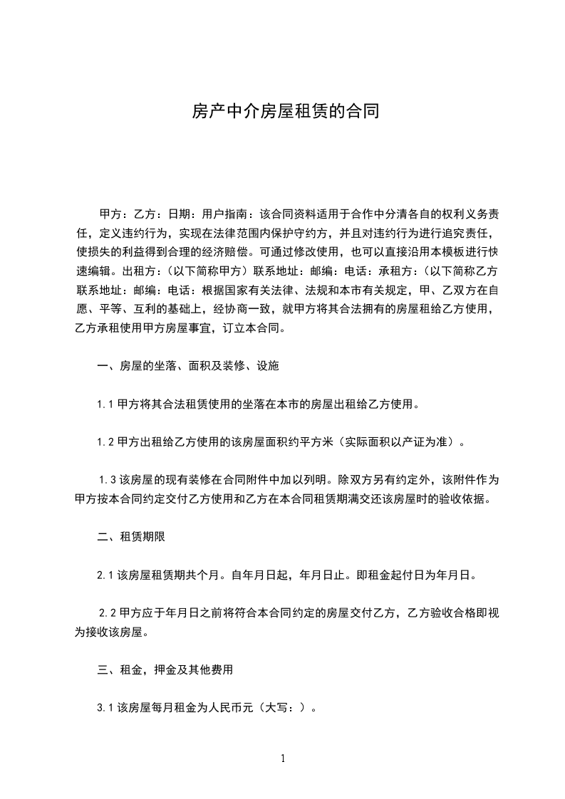 甲方:乙方:日期:用户指南:该合同资料适用于合作中分清各自的权利义务责任,定义违约行为,实现在法律范围内保护守约方,并且对违约行为进行追究责任,使损失的利益得到合理的经济赔偿。可通过修改使用,也可以直接沿用本模板进行快速编辑。出租方:(以下简称甲方)联系地址:邮编:电话:承租方:(以下简称乙方)联系地址:邮编:电话:根据国家有关法律、法规和本市有关规定,甲、乙双方在自愿、平等、互利的基础上,经协商一致,就甲方将其合法拥有的房屋租给乙方使用,乙方承租使用甲方房屋事宜,订立本合同。