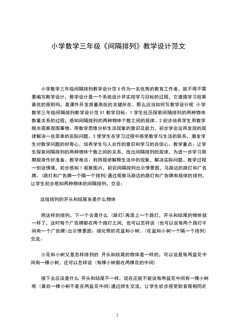 小学数学三年级间隔排列教学设计范X作为一名优秀的教育工作者,就不得不需要编写教学设计,教学设计是一个系统设计并实现学习目标的过程,它遵循学习效果最优的原则吗,是课件开发质量高低的关键所在。那么应当如何写教学设计呢 小学数学三年级间隔排列教学设计范X1教学目标:1学生经历探索间隔排列的两种物体数量关系的过程,感知间隔排列的两种物体个数之间的规律。2初步培养学生用数学眼光观察周围事物、用数学思维分析生活现象的意识及能力,初步学会运用发现的规律解决一些简单的实际问题。3使学生在学习过程中感受数学与生活的联系,激发学生对数学问题的好奇心,培养学生与人合作的意识和学习的自信心。教学重点:让学生探索间隔排列的两种物体个数之间的关系,找出间隔排列的规律,为进一步学习周期规律作好准备。教学难点:利用规律解释生活中的现象,解决实际问题。教学过程:一创设情境,初步感知1观察图片,初识间隔排列出示情景图,马路边的路灯和广告牌。(路灯和广告牌一个隔一个排列)通过观察马路边的路灯和广告牌有规律的排列,让学生初步感知两种物体的间隔排列。交流: