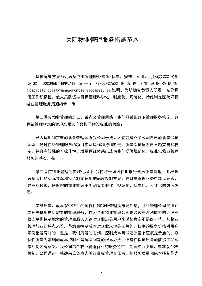 整体解决方案系列医院物业管理服务措施(标准、完整、实用、可修改)XXX实用范本|DOCUMENTTEMPLATE编号:FS-QG-27653医院物业管理服务措施Hospitalpropertymanagementservicemeasures说明:为明确各负责人职责,充分调用工作积极性,使人员队伍与目标管理科学化、制度化、规范化,特此制定医院项目物业管理服务措施结合__市