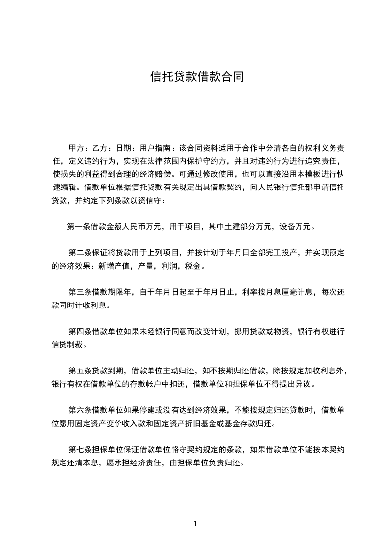 甲方:乙方:日期:用户指南:该合同资料适用于合作中分清各自的权利义务责任,定义违约行为,实现在法律范围内保护守约方,并且对违约行为进行追究责任,使损失的利益得到合理的经济赔偿。可通过修改使用,也可以直接沿用本模板进行快速编辑。借款单位根据信托贷款有关规定出具借款契约,向人民银行信托部申请信托贷款,并约定下列条款以资信守:
