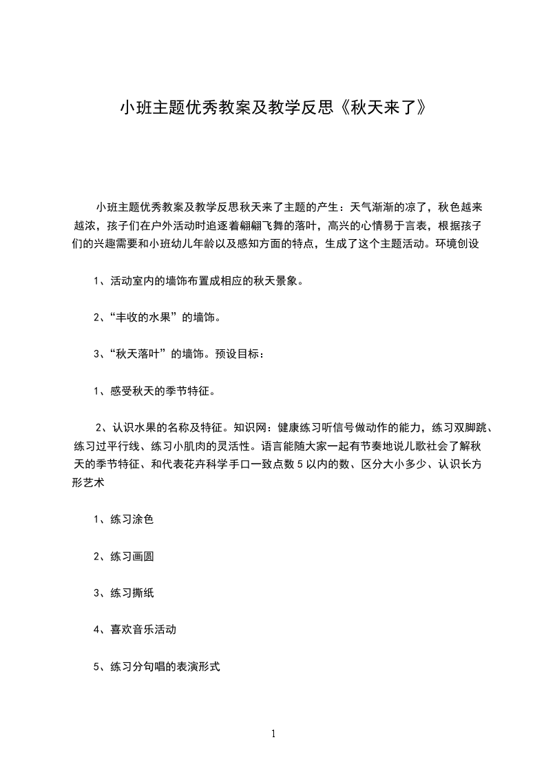 小班主题优秀教案及教学反思秋天来了主题的产生:天气渐渐的凉了,秋色越来越浓,孩子们在户外活动时追逐着翩翩飞舞的落叶,高兴的心情易于言表,根据孩子们的兴趣需要和小班幼儿年龄以及感知方面的特点,生成了这个主题活动。环境创设: