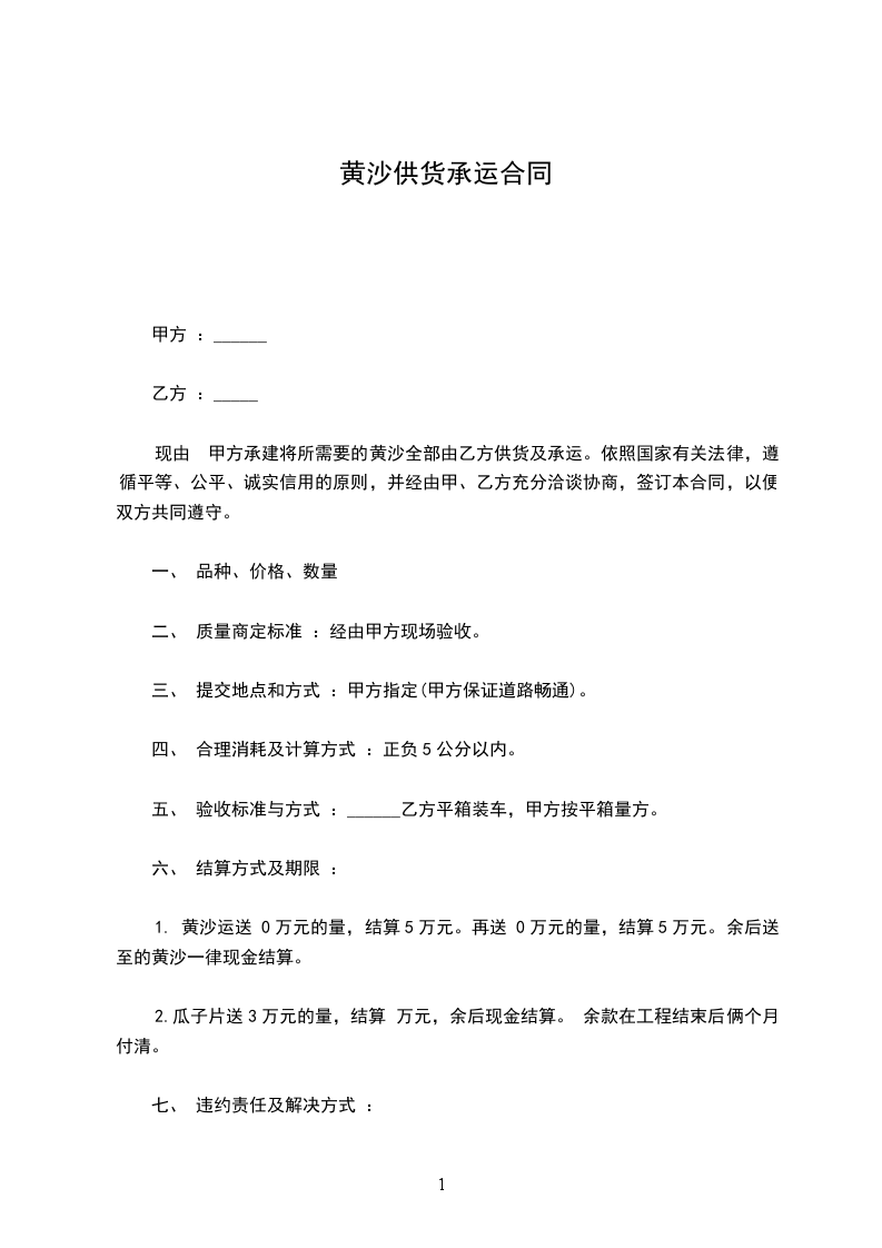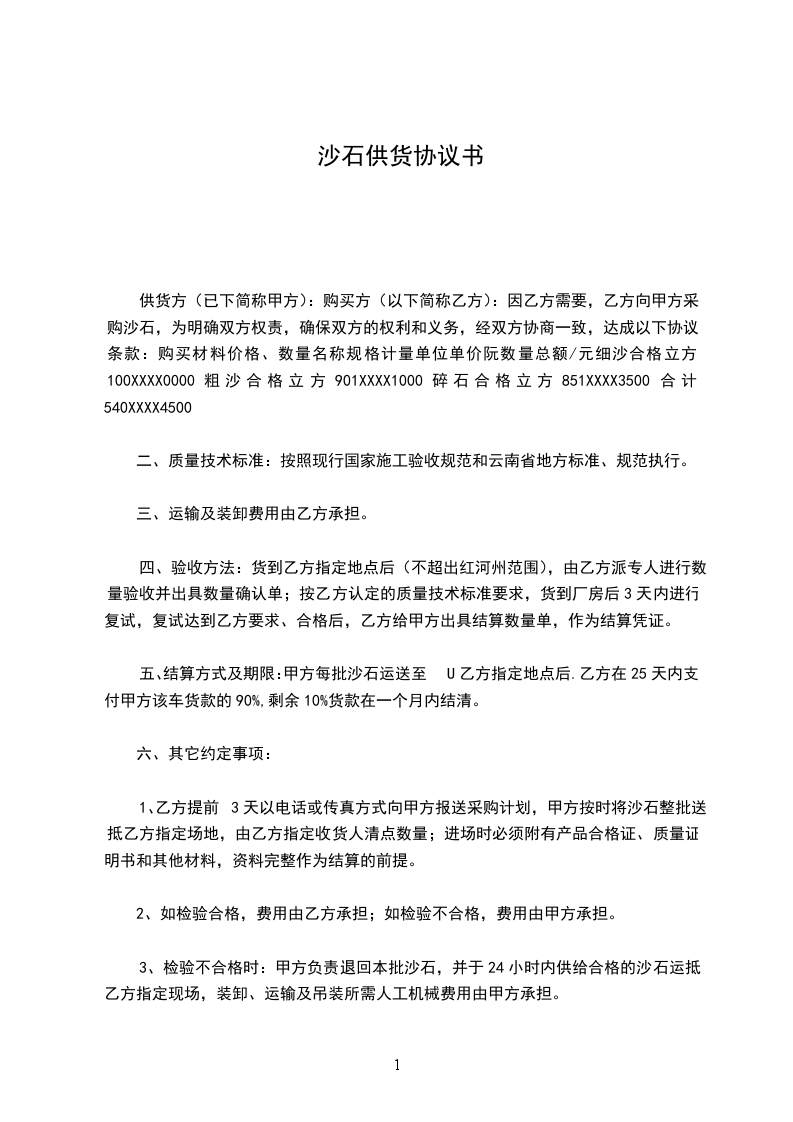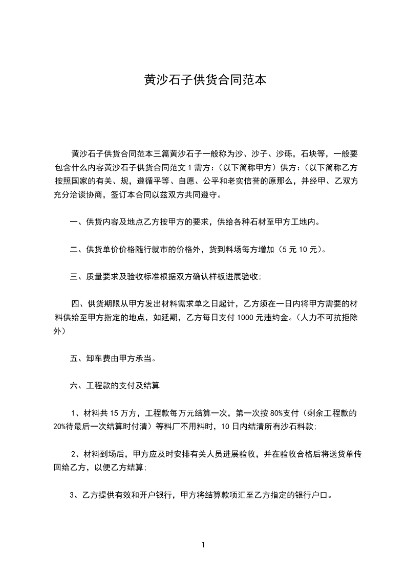 三、付款方式经双方协商,乙方向甲方每供货m,七日内结清贷款一次,工程开工后,10日内付清全部材料款。如违约按总贷款%收取违约金。以上合同甲、乙双方共同遵守,不得违约,不得擅自更改合同和终止合同。此合同一式两份,甲、乙各持一份,自签订之日起生效。甲方(公章):乙方(公章):法定代表人(签字):法定代表人(签字):年月日年月日黄沙石子供货合同范文3甲方:乙方:兹有甲方现将宿州市浍水西路下关中学南XX的中央大厦工程的石子、黄砂用料由乙方提供,本着平等互利,各种其责任的原那么,经双方协商特签订合同如下: