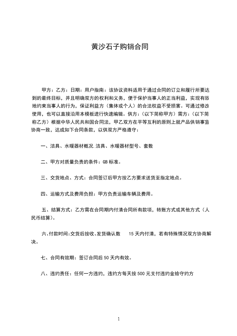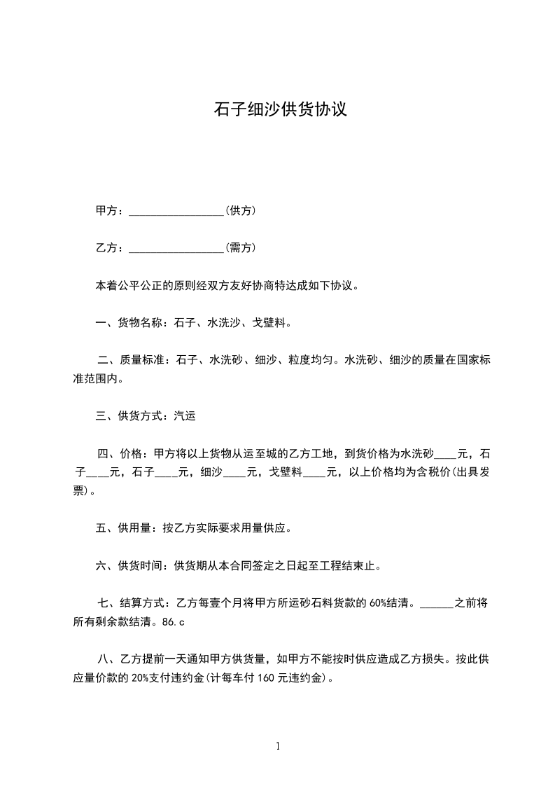2、乙方无故不交货或甲方无故退货,(非质量因素)视为违约,违约方应向对方支付不履行部份货款的50%作违约金。其他未尽事宜双方协商。甲方(公章):乙方(公章):法定代表人(签字):法定代表人(签字):年月日年月日黄沙石子供货合同范文2甲方:乙方:经协商,乙方为甲方工地提供黄沙、石子,黄沙价格元/m、石子价格元/m长期用货,价格按市场价计算,为保障供给和维护甲、乙各自的利益,特定以下合同,双方共同遵守: