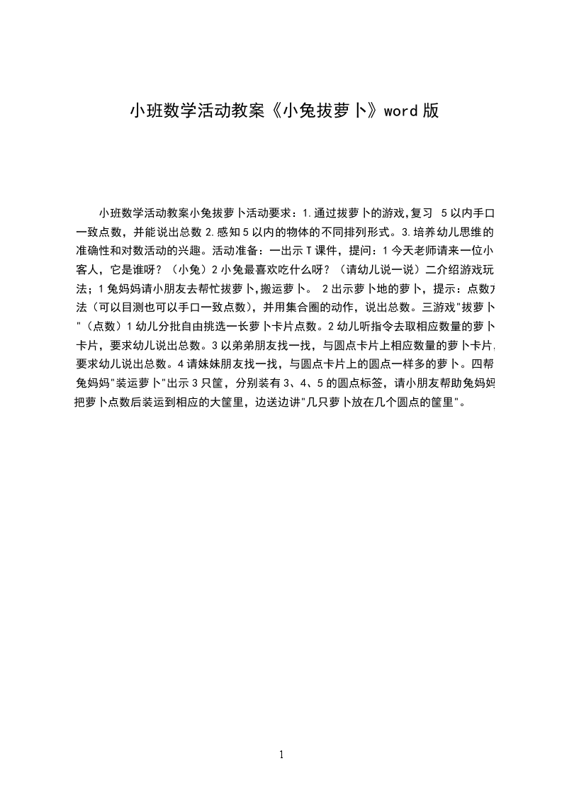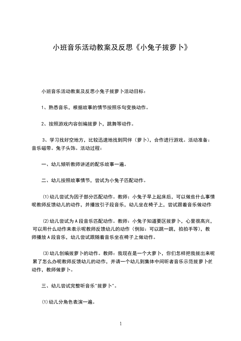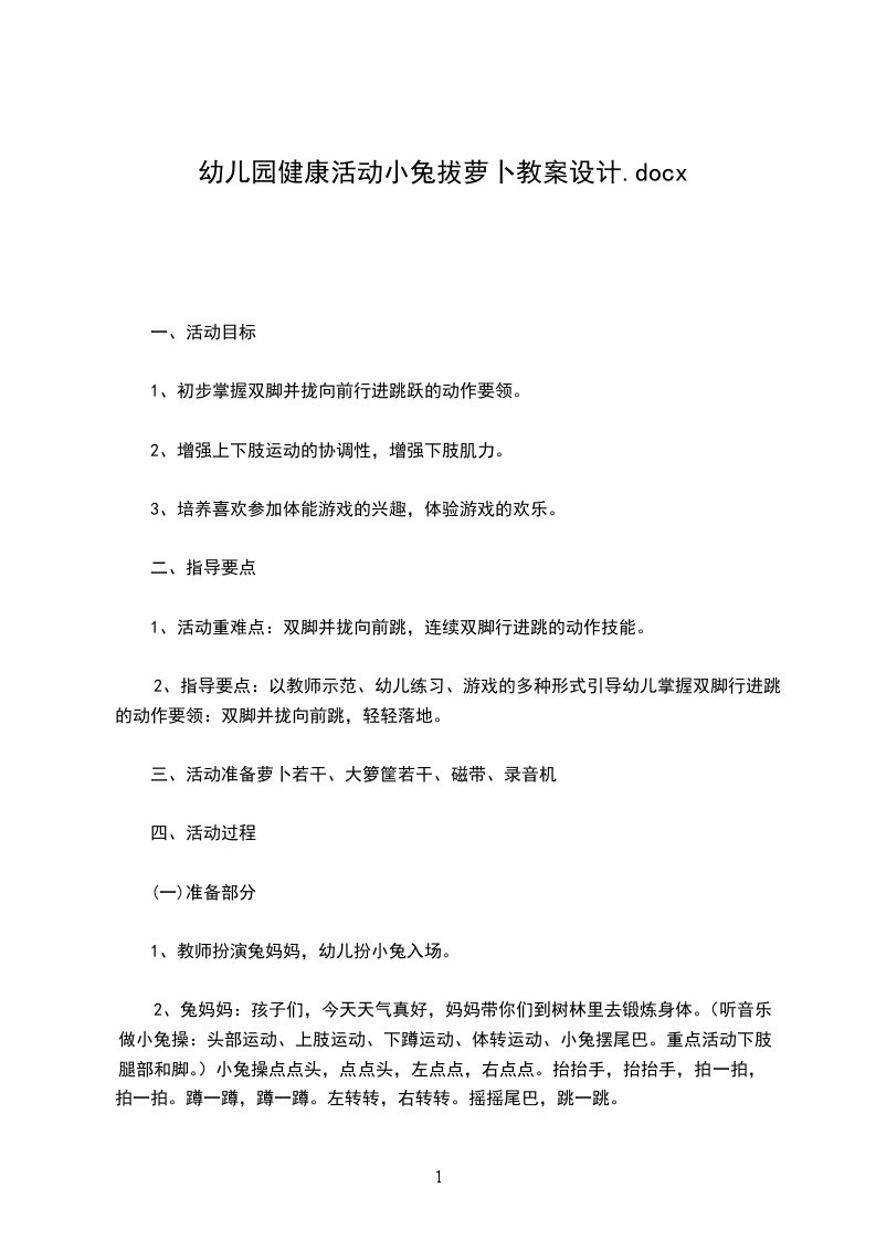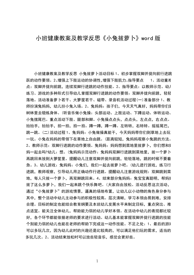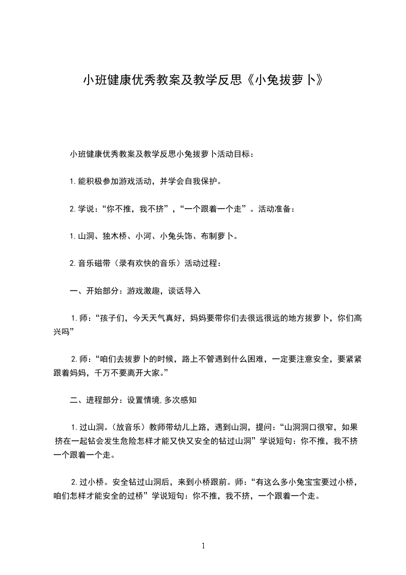 三、结束部分:快乐体验,巩固行为。“终于拔完萝卜,小兔宝宝们一定累了,现在咱们拿着萝卜和妈妈一起回家吧。”在音乐声中,幼儿模仿小兔动作“你不推,我不挤,一个挨着一个”出活动室。活动反思:本次活动内容孩子们非常喜欢,富有故事情景的场地设置,充分调动了孩子的积极性,幼儿参与活动的积极性很高。但由于孩子年龄小不能够准确的表述自己的肢体动作,幼儿自由探索跳、说一说环节有点儿高估了孩子的能力。好在孩子们都有跳的基础,做跳的动作都还不错。拔萝卜环节,如果能引导幼儿先过小桥再过草地可能对发展全体幼儿的肢体动作会更为理想一些。