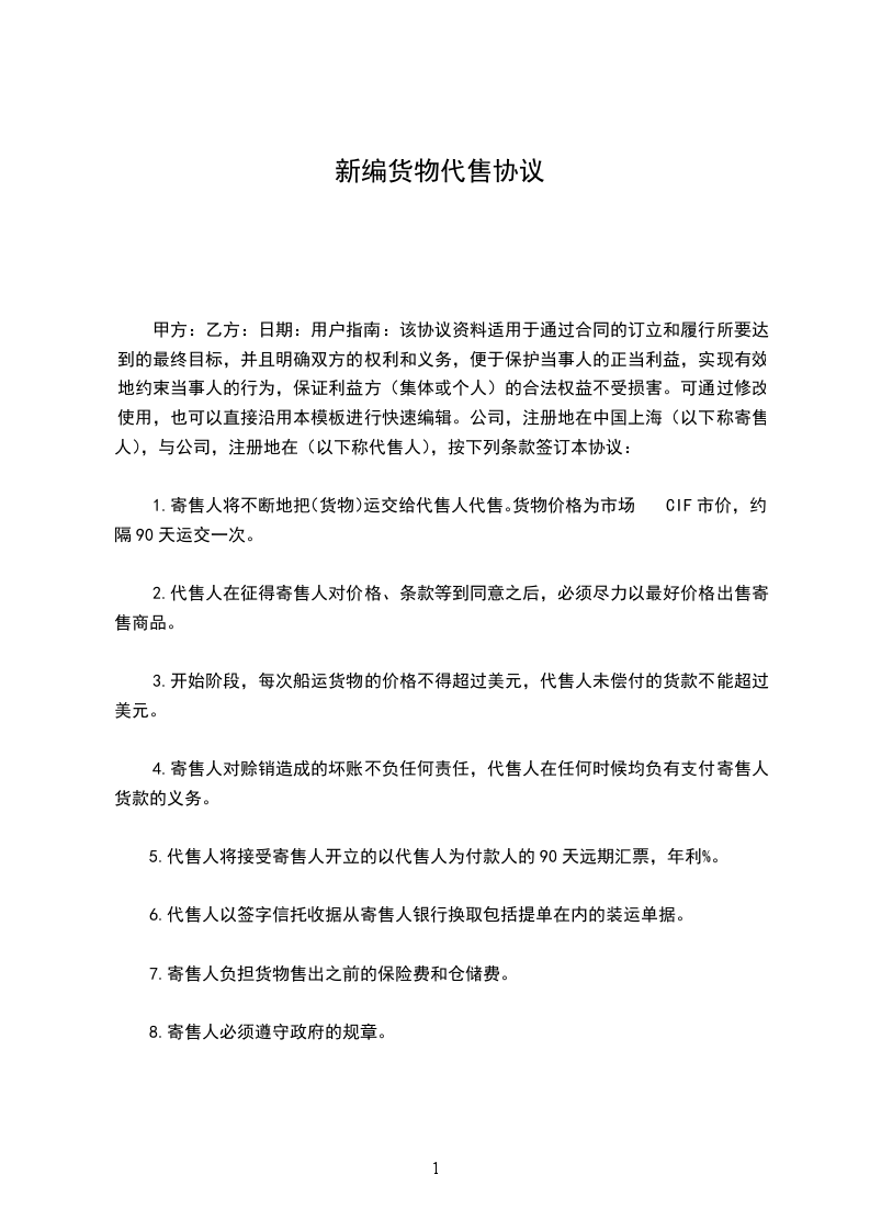 甲方:乙方:日期:用户指南:该协议资料适用于通过合同的订立和履行所要达到的最终目标,并且明确双方的权利和义务,便于保护当事人的正当利益,实现有效地约束当事人的行为,保证利益方(集体或个人)的合法权益不受损害。可通过修改使用,也可以直接沿用本模板进行快速编辑。公司,注册地在中国上海(以下称寄售人),与公司,注册地在(以下称代售人),按下列条款签订本协议: