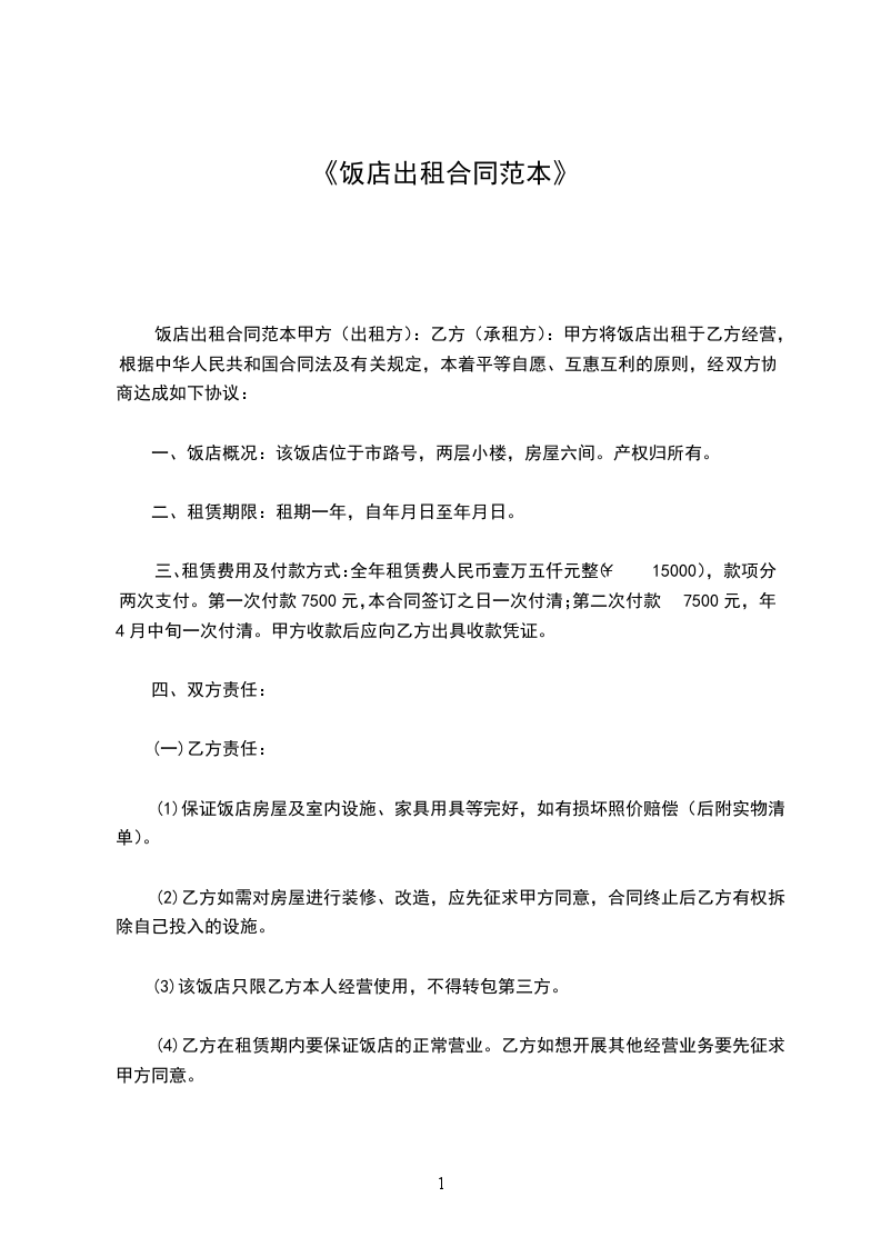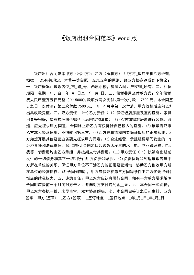 饭店出租合同范本甲方(出租方):乙方(承租方):甲方将饭店出租于乙方经营,根据中华人民共和国合同法及有关规定,本着平等自愿、互惠互利的原则,经双方协商达成如下协议:
