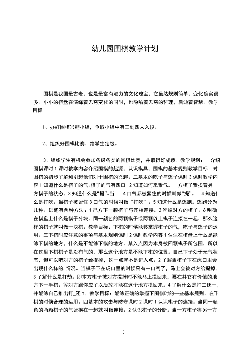 3、组织学生有机会参加各级各类的围棋比赛,并取得好成绩。教学规划:一介绍围棋课时1课时教学内容介绍围棋的起源,认识棋具,围棋的基本规则教学目标:对围棋的初步了解和引起他们对于围棋的兴趣。二基本的吃子与逃子课时3课时教学内容1知道什么是棋子的气。棋子的气有四口2知道如何来紧气。一方棋子紧挨着另一方棋子的状态。3知道什么是“提”。当4口气都被紧住的时候叫做“提”。4知道什么是打吃。当棋子被紧住3口气的时候叫做“打吃”。5知道什么是逃跑。逃跑分为几种。逃跑有两种方法:1己方下一颗棋子与其相连接。2吃掉对方的棋子。6明确在棋盘上什么是棋子分块。同一颜色的两颗棋子或两颗以上棋子连接在一起,那么这样的棋子就叫做一块棋。教学目标:下棋的时候能够掌握棋子的气,吃子与逃子的运用。三下棋时应注意的事项与基本规则课时2课时教学内容1认识在棋盘上什么是能够下棋的地方,什么是不能够下棋的地方。禁入点因为本身被四颗棋子所包围,所以在这里下棋棋子是没有气的,那么这个地方是不能下棋的位置。自己下子处于无气状态,但可以吧对方的棋子给提掉,这一点就不是进入点。2了解当棋子下在虎口里会出现什么样的.情况。当棋子下在虎口里的时候只有一口气了,马上会被对方给提掉。3了解什么是打劫。即本方棋子被对方提掉时不能马上提回来,要在其它有价值的地方下一手棋。等对方跟你应了以后放才能在这个地方提回来。4了解什么是打二还一,并能够自己推出打_还Y。教学目标:能够正确的掌握下围棋时的一些基本规则,在下棋的时候合理的运用。四基本的攻击与防守课时2课时1认识棋子的连接。当同一颜色的两颗棋子的气紧挨在一起就叫做连接。2认识棋子的分断。当一方棋子将另一方棋子分开,那么就叫做分断。3了解怎么保护断点。有两种方式:1用连接的方式。2吃棋也可以保护断点。3用虎口也可以保护断点。4明确认识双打吃。当对方的棋子出现两个断点,那么在这两个断点的中心处进行攻击,将两块棋分开并能吃掉一方的下法叫做双打吃。5认识什么是关门吃。在攻击时,借助本方的厚势将对方薄弱的棋子分断开并将对方的棋子吃掉。教学目标:能够正确的掌握下棋时基本的攻击与防守方法。五下棋时的基本方向课时2课时1认识基本的吃子方向。像有厚势的一方吃。二线吃棋由二路线像一路线打吃,使对方被赶往一路线上。三线吃棋由三路线打吃赶往二路线。都是将对方的棋子像自己厚势的地方追赶,进行攻击。(需要两课时)2认识什么是抱吃。对对方的棋子进行攻击,将对方的棋子赶往自己的厚势上。这样的吃法叫做抱吃。3认识什么是征吃。在攻击时,通过连续的紧气迫使对方的棋子不断的像己方的厚势或一路线上追赶并最终将对方的棋子吃掉。教学目标:使学生能够正确的认识攻击时的方向。六枷吃课时1课时认识什么是枷吃。通过利用飞与跳的手段将对方的棋子给罩住,使其不能够出头。那么这样的方法就是枷吃。教学目标:使学生能够正确的找到要攻击的棋子的头在什么地方。然后,能够利用枷吃的方法将其吃掉。