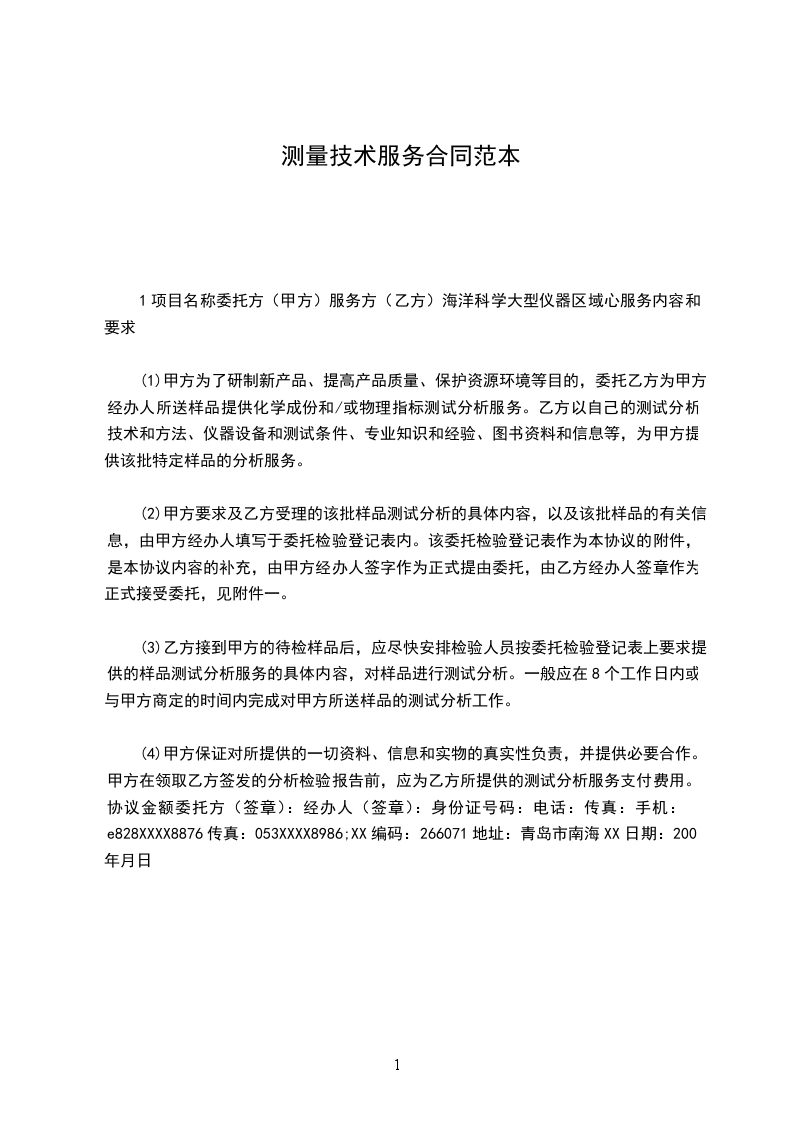 (4)甲方保证对所提供的一切资料、信息和实物的真实性负责,并提供必要合作。甲方在领取乙方签发的分析检验报告前,应为乙方所提供的测试分析服务支付费用。协议金额委托方(签章):经办人(签章):身份证号码:电话:传真:手机:e828XXXX8876传真:053XXXX8986;XX编码:266071地址:青岛市南海XX日期:200年月日
