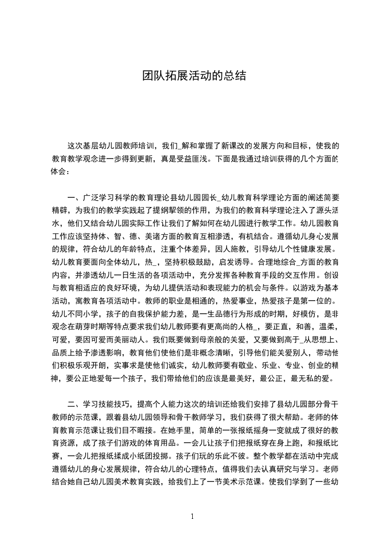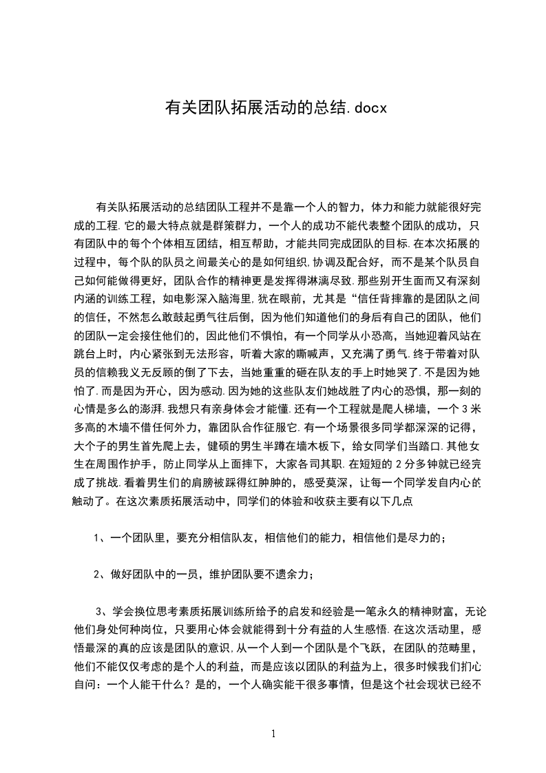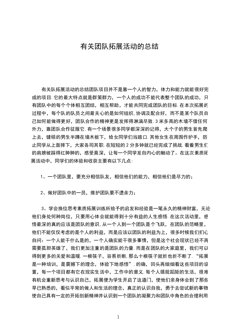 有关队拓展活动的总结团队项目并不是靠一个人的智力,体力和能力就能很好完成的项目.它的最大特点就是群策群力,一个人的成功不能代表整个团队的成功,只有团队中的每个个体相互团结,相互帮助,才能共同完成团队的目标.在本次拓展的过程中,每个队的队员之间最关心的是如何组织,协调及配合好,而不是某个队员自己如何能做得更好,团队合作的精神更是发挥得淋漓尽致.3米多高的木墙不借任何外力,靠团队合作征服它.有一个场景很多同学都深深的记得,大个子的男生首先爬上去,健硕的男生半蹲在墙木板下,给女同学们当踏口.其他女生在周围作护手,防止同学从上面摔下,大家各司其职.在短短的2分多钟就已经完成了挑战.看着男生们的肩膀被踩得红肿肿的,感受莫深,让每一个同学发自内心的触动了。在这次素质拓展活动中,同学们的体验和收获主要有以下几点: