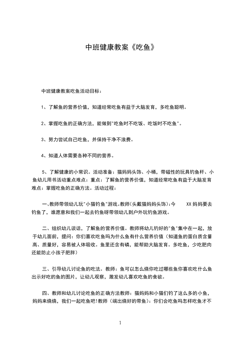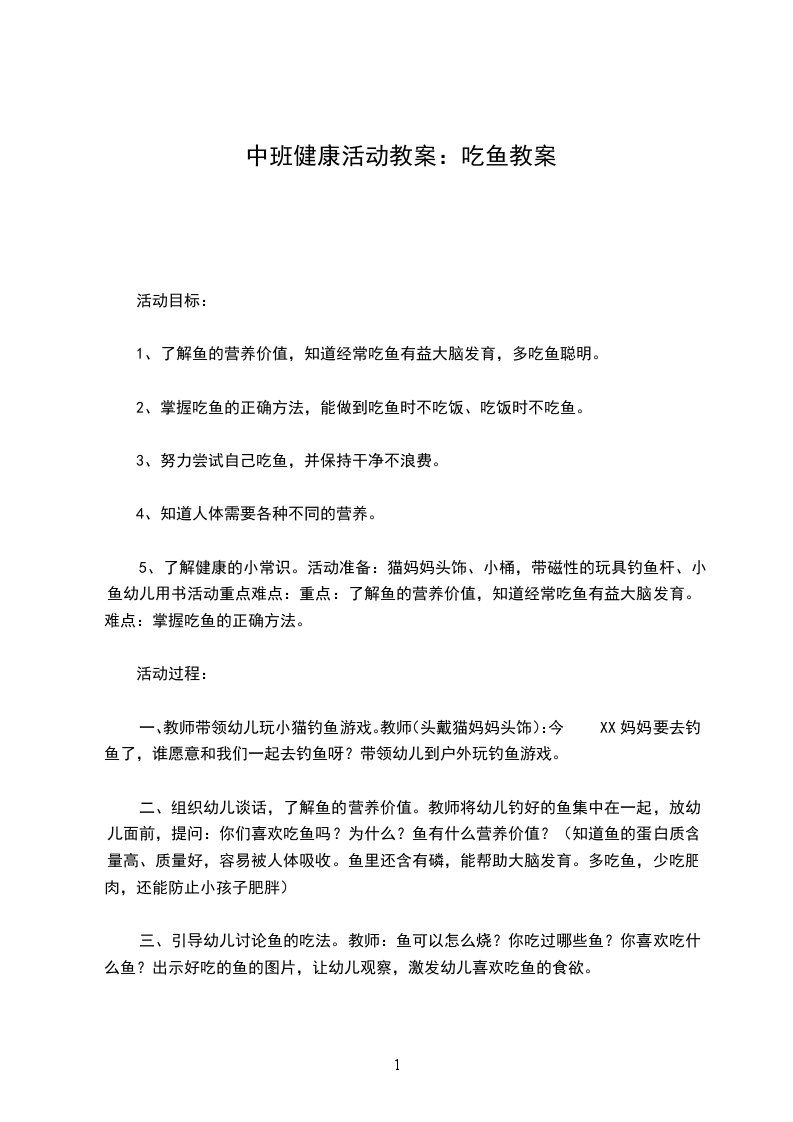 5、了解健康的小常识。活动准备:猫妈妈头饰、小桶,带磁性的玩具钓鱼杆、小鱼幼儿用书活动重点难点:重点:了解鱼的营养价值,知道经常吃鱼有益于大脑发育。难点:掌握吃鱼的正确方法。活动过程: