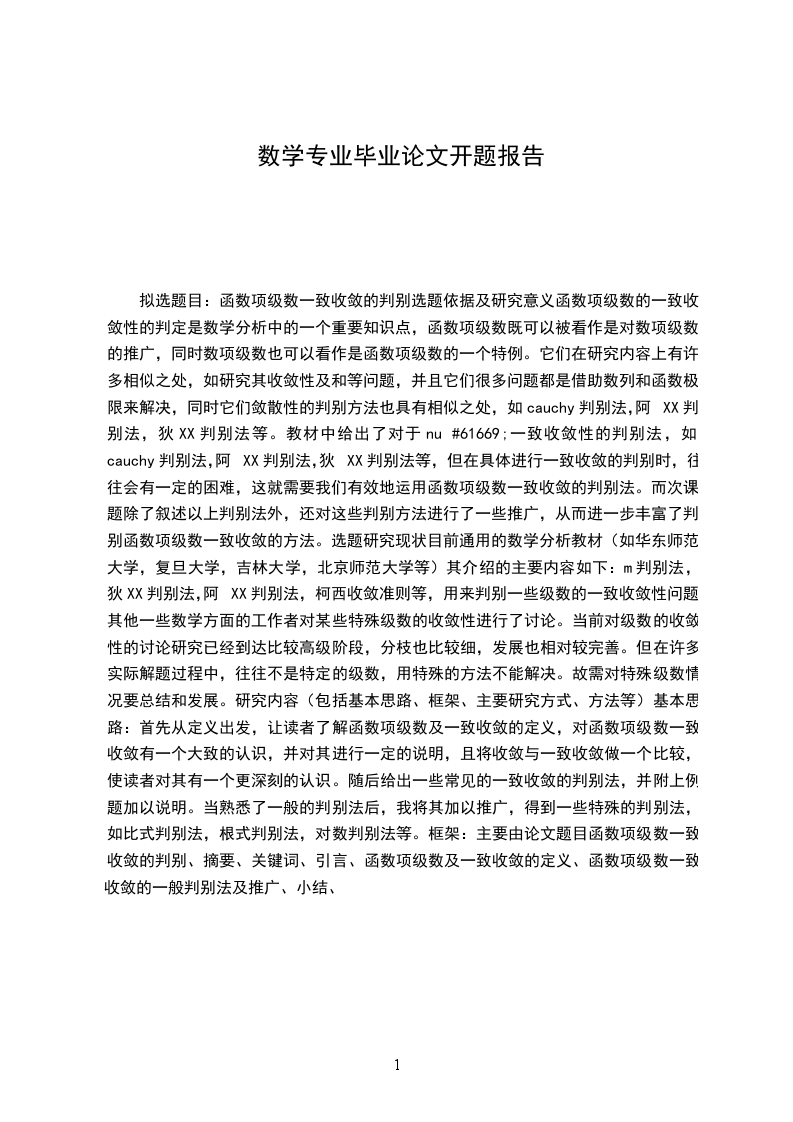 拟选题目:函数项级数一致收敛的判别选题依据及研究意义函数项级数的一致收敛性的判定是数学分析中的一个重要知识点,函数项级数既可以被看作是对数项级数的推广,同时数项级数也可以看作是函数项级数的一个特例。它们在研究内容上有许多相似之处,如研究其收敛性及和等问题,并且它们很多问题都是借助数列和函数极限来解决,同时它们敛散性的判别方法也具有相似之处,如cauchy判别法,阿XX判别法,狄XX判别法等。教材中给出了对于nu #61669;一致收敛性的判别法,如cauchy判别法,阿XX判别法,狄XX判别法等,但在具体进行一致收敛的判别时,往往会有一定的困难,这就需要我们有效地运用函数项级数一致收敛的判别法。而次课题除了叙述以上判别法外,还对这些判别方法进行了一些推广,从而进一步丰富了判别函数项级数一致收敛的方法。选题研究现状目前通用的数学分析教材(如华东师范大学,复旦大学,吉林大学,北京师范大学等)其介绍的主要内容如下:m判别法,狄XX判别法,阿XX判别法,柯西收敛准则等,用来判别一些级数的一致收敛性问题,其他一些数学方面的工作者对某些特殊级数的收敛性进行了讨论。当前对级数的收敛性的讨论研究已经到达比较高级阶段,分枝也比较细,发展也相对较完善。但在许多实际解题过程中,往往不是特定的级数,用特殊的方法不能解决。故需对特殊级数情况要总结和发展。研究内容(包括基本思路、框架、主要研究方式、方法等)基本思路:首先从定义出发,让读者了解函数项级数及一致收敛的定义,对函数项级数一致收敛有一个大致的认识,并对其进行一定的说明,且将收敛与一致收敛做一个比较,使读者对其有一个更深刻的认识。随后给出一些常见的一致收敛的判别法,并附上例题加以说明。当熟悉了一般的判别法后,我将其加以推广,得到一些特殊的判别法,如比式判别法,根式判别法,对数判别法等。框架:主要由论文题目函数项级数一致收敛的判别、摘要、关键词、引言、函数项级数及一致收敛的定义、函数项级数一致收敛的一般判别法及推广、小结、