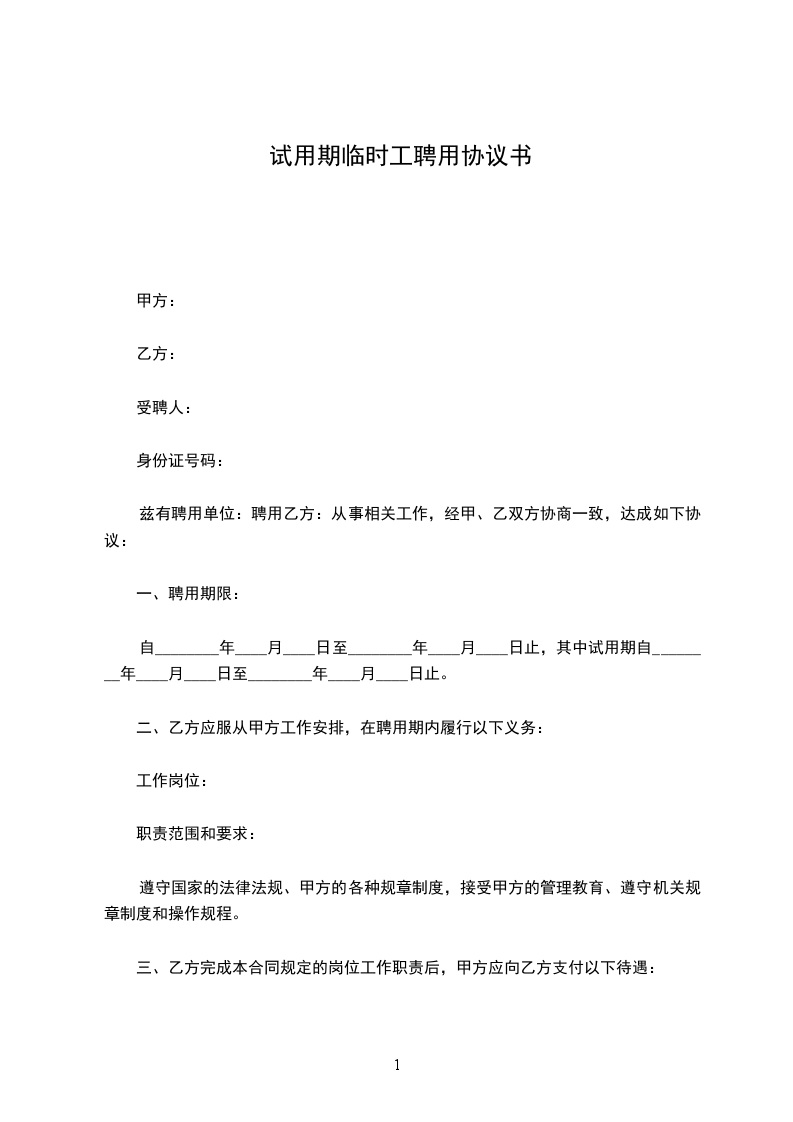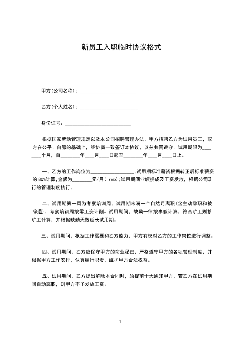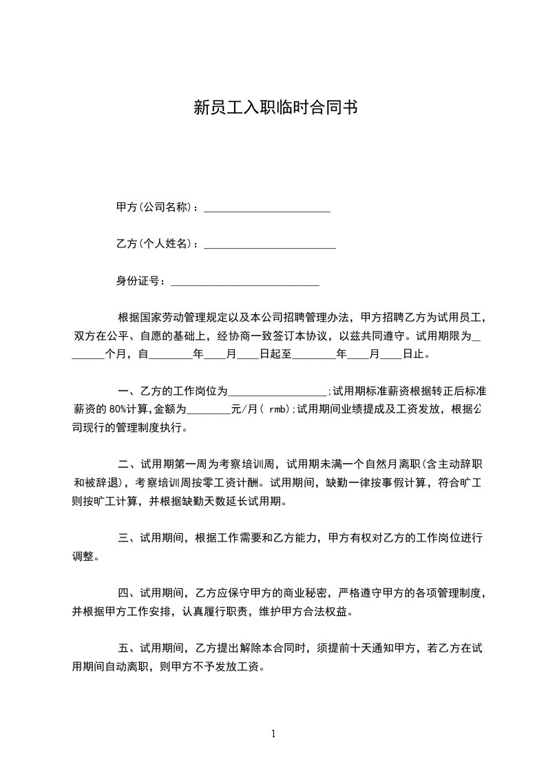 新员工试用期临时劳动合同甲方:有限公司乙方:甲乙双方按照合法、公平、平等自愿、协商一致、诚实信用的原则订立本合同。