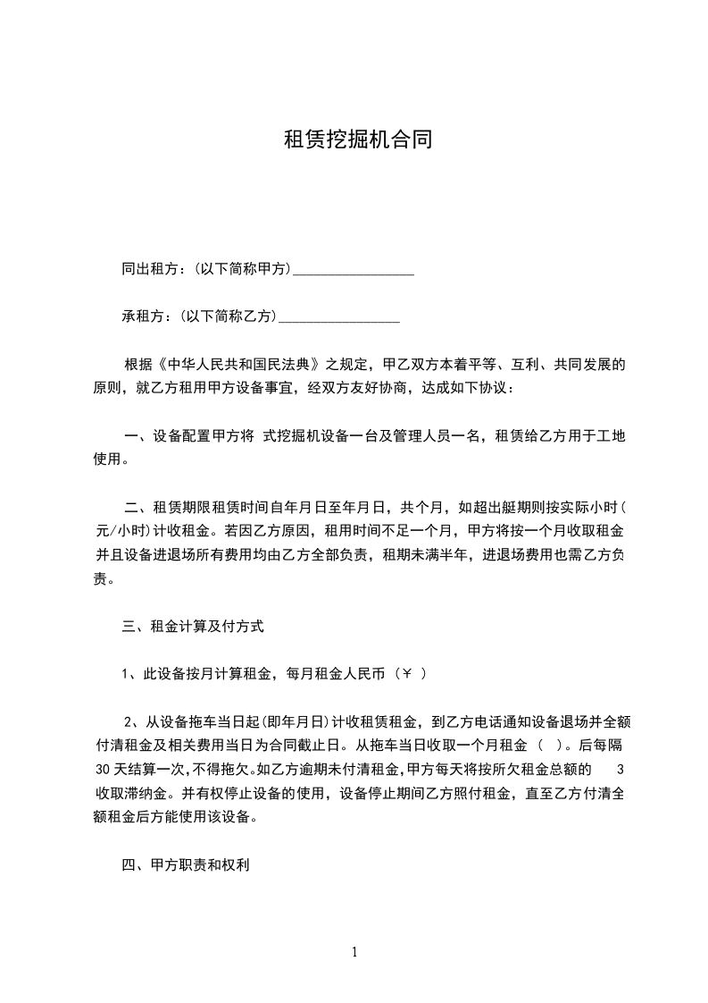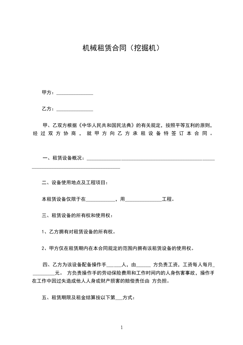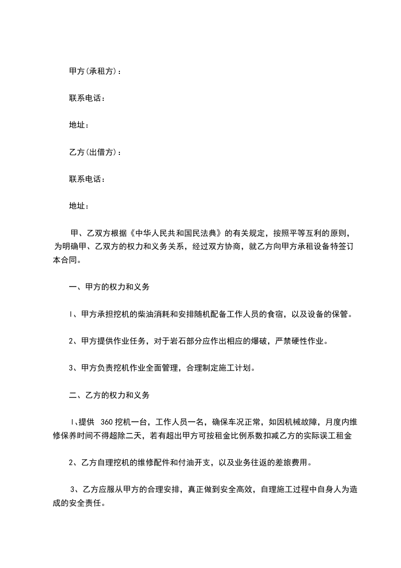 甲方:乙方:日期:用户指南:该合同资料适用于合作中分清各自的权利义务责任,定义违约行为,实现在法律范围内保护守约方,并且对违约行为进行追究责任,使损失的利益得到合理的经济赔偿。可通过修改使用,也可以直接沿用本模板进行快速编辑。出租方(甲方):承租方(乙方):根据民法典的规定,经双方协商一致,就乙方向甲方承租以下设备达成协议: