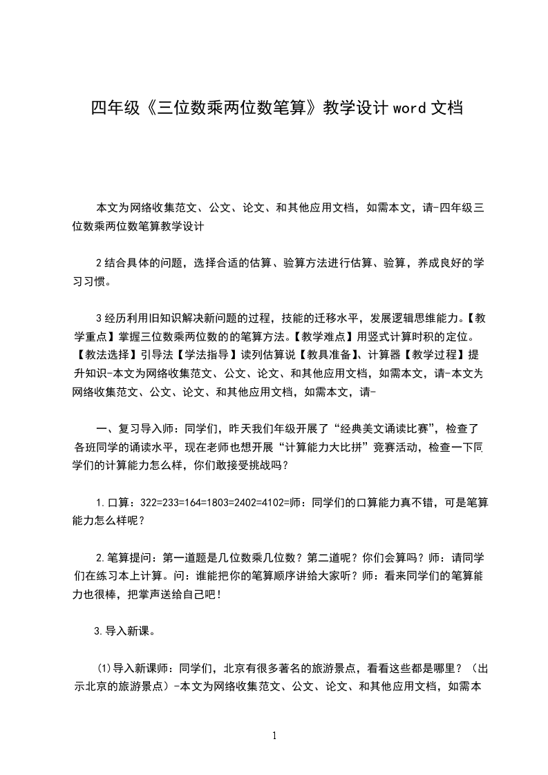四年级上册三位数乘两位数笔算教学设计教学目标: